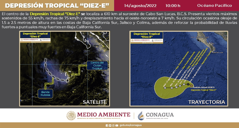 Debido a la depresión tropical “Diez-E”, que se encuentra en el Océano Pacífico, Jalisco registrará lluvias muy fuertes para este domingo 14 de agosto, según informó la Comisión Nacional del Agua (Conagua) en su pronóstico diario. “La depresión tropical “Diez-E” en el Océano Pacífico, se desplazará al suroeste de Península de Baja California y su circulación generará oleaje de 1.5 a 2.5 metros de altura en las costas de Baja California Sur”, informó la dependencia. Además de Jalisco, Zacatecas, Aguascalientes, Michoacán, Guanajuato, Querétaro y el Estado de México también registrarán lluvias puntuales muy fuertes, que podrían originar incremento en los niveles de ríos y arroyos, inundaciones y deslaves en zonas bajas.“Canales de baja presión sobre la Península de Yucatán, y en el oriente y sureste del territorio nacional, en combinación con la entrada de humedad proveniente del Golfo de México y Mar Caribe, producirán lluvias puntuales muy fuertes en Puebla, Oaxaca y Chiapas, puntuales fuertes en Veracruz y chubascos en Tabasco, Campeche, Yucatán y Quintana Roo”. Según la Conagua, la depresión tropical “Diez-E” se localiza a 610 kilómetros al suroeste de Cabo San Lucas, Baja California Sur, y presenta vientos máximos sostenidos de 55 kilómetros por hora, con rachas de 75 km/h y desplazamiento hacia al oeste-noroeste a siete km/h.GC