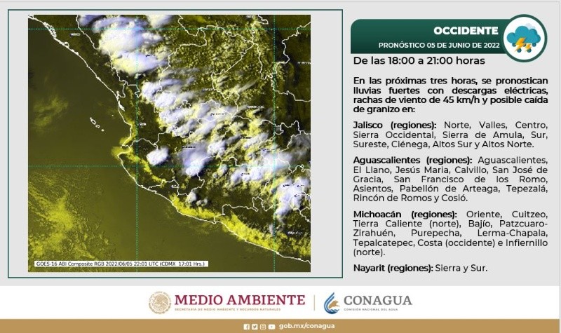 En las próximas horas se prevé que en Jalisco se registren lluvias fuertes, derivado de los canales de baja presión sobre el norte, occidente, centro, sur y sureste de México, en interacción con inestabilidad atmosférica y el ingreso de humedad proveniente de ambos océanos y el Mar Caribe.Así lo informó la Comisión Nacional del Agua, en coordinación con la Secretaría de Medio Ambiente y Recursos Naturales, quienes dieron a conocer que este pronóstico se repite también para los estados de Chiapas, Durango, Estado de México, Guerrero, Michoacán, Morelos, Oaxaca y Puebla.En el caso de Chihuahua, Colima, Guanajuato, Nayarit, Quintana Roo, Tlaxcala, Veracruz, Yucatán y Zacatecas, se prevé que la lluvia venga acompañada de descargas eléctricas y granizo.“En cuanto a la tormenta tropical Alex, ésta sigue su desplazamiento hacia el este-noreste en aguas del Océano Atlántico, alejándose cada vez más del continente americano”, señalaron las autoridades federales a través de un comunicado.De acuerdo con la Conagua y la Secretaría de Medio Ambiente, se estima que para Jalisco continúen en los próximos días temperaturas entre los 35 y los 40 grados Celsius.Además, se prevé que persista la posibilidad de lluvias fuertes en Chiapas, Chihuahua, Durango, Guerrero, Jalisco, Michoacán y Oaxaca; chubascos en Campeche, Colima, Estado de México, Morelos, Nayarit, Puebla, Quintana Roo, Yucatán y Zacatecas.