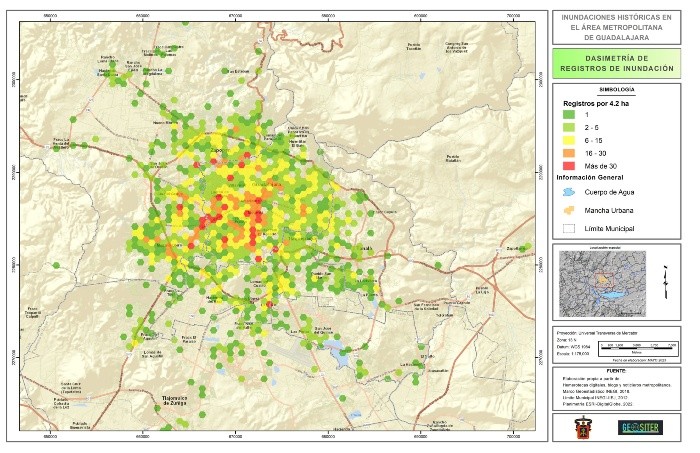 En los últimos cinco años se sumaron 31 puntos de riesgo de inundación, señaló el profesor investigador del Departamento de Geografía y Ordenación Territorial del Centro Universitario de Ciencias Sociales y Humanidades (CUCSH), Luis Valdivia Ornelas.Refirió que se encuentran principalmente en las colonias del centro y poniente del Valle de Atemajac, el surponiente de Tesistán y del Valle de Toluquilla, lo que indica que están siendo urbanizadas las partes altas de los cerros que circundan Guadalajara y que antes servían como espacios para que el agua se infiltrara."Esto está originando no sólo más zonas de riesgo para la población, sino alta peligrosidad, debido a que bajan mayores volúmenes de agua de lluvia con más fuerza porque el líquido no encuentra espacios naturales por donde circular y quedarse", dijo.Las colonias con los nuevos puntos de inundación están en el área de Santa Anita, El Garabato, Santa Ana Tepetitlán, las intersecciones de Periférico y Guadalupe, y Guadalupe y Clouthier; Ciudad Granja, Rancho Contento, Technology Park, el pueblo de La Venta del Astillero, la zona de El Campestre, Los Molinos y Los Tréboles; además de Residencial Tesistán, La Vinatera, El Capistrano, Santa Lucía y Bosque de los Encinos.El urbanista Édgar Leonel Gutiérrez, estudiante de la maestría de Desarrollo Local y Territorio, dijo que en junio pasado, al inicio del temporal de lluvia, hubo 82 eventos de inundación en diversos puntos; el más crítico fue el 6 de junio, con 24 eventos; uno de ellos en un lugar nuevo, afuera de la estación Belenes de la Línea 3 del Tren Ligero; mientras que en julio hubo 92 eventos, en agosto 35, en septiembre ninguno, debido a la poca lluvia y en octubre, 16.Señaló que el 14 de junio del año pasado se rompió el récord de agua acumulada en la zona Centro, que fue de 158 milímetros cúbicos de acumulación agua de lluvia, mientras que en la zona de La Experiencia se llegó a los 19.8 milímetros cúbicos.Los especialistas advirtieron sobre la necesidad de que la población esté informada respecto a estos puntos para evitar las zonas y posibles problemas de movilidad, además de evitar cualquier paso a desnivel y cauces de ríos que tienden a inundarse y a desbordarse con poca lluvia.Investigadores de la UdeG, y la empresa Geositer, crearon el primer mapa digital de zonas de riesgo por inundación en el Área Metropolitana de Guadalajara (AMG), con la intención de que tanto sus habitantes como las instancias de gobierno conozcan los 570 puntos y cinco mil 200 incidencias de riesgo en más de un siglo para que puedan tomar decisiones y emprender acciones de prevención.El profesor investigador del Departamento de Geografía y Ordenación Territorial del CUCSH, Luis Valdivia Ornelas, dio a conocer que este mapa reúne 15 años de trabajo académico y de campo en materia de identificación de zonas de inundación y una labor de sistematización de dichos datos por parte de esa empresa de consultoría, y que es único en su tipo.“El mapa abarca 106 años de inundaciones; tiene las inundaciones históricas y actuales porque, por desgracia, en Guadalajara lo que se inundaba antes se sigue inundando. Es una base de datos muy amplia, completa. Consideramos que es el mejor diagnóstico que se tiene del fenómeno de inundaciones del Área Metropolitana; a partir de este diagnóstico se puede establecer un entendimiento de cuál es el origen del problema y estrategias de mitigación”, dijo.Señaló que la intención de la elaboración del mapa es que sea un insumo para entender el problema de las inundaciones desde la información técnica, mediante los patrones de distribución de las inundaciones en los más de cinco mil sitios de incidencias identificados, tres mil polígonos de inundación y las 570 zonas de inundación.“Con esto podemos entender cómo están distribuidas las inundaciones. Nos indica cuáles son las variables que están involucradas en la génesis de éstas porque no nada más está involucrada la lluvia, sino las transformaciones en las condiciones naturales por el crecimiento urbano; ese es el factor determinante, porque en Guadalajara siempre ha llovido mucho, el patrón de precipitaciones de fuerte intensidad es un patrón normal, no es la causa de las inundaciones, sino la manera en que se dio el crecimiento urbano y el rezago de la infraestructura generada por la autoridades en los últimos años”, explicó Valdivia Ornelas.El estudiante de la maestría de Desarrollo Local y Territorio del CUCSH y miembro de la empresa Geositer, Samuel Alatorre Ramos, detalló que el mapa abarca las incidencias de inundación reportadas en los últimos años en nueve municipios mediante sistemas de posicionamiento geográfico y muestra de forma interactiva las zonas con más inundaciones, los niveles de concentración de agua en cada uno y su identificación calle por calle; además de datos como la fecha en la que se reportó la inundación más reciente.Andrés García, integrante de Geosister, dijo que los especialistas trabajan en los datos que alimentarán este mapa, que estará en una página web que será pública y gratuita a partir de junio de este año.A mediano plazo, y gracias a la colaboración de ambas instancias, la página web “Georriesgos Jalisco” incluirá, además, otros fenómenos naturales como sismos y deslizamientos.
