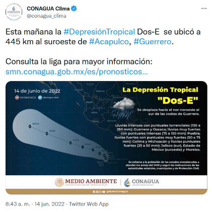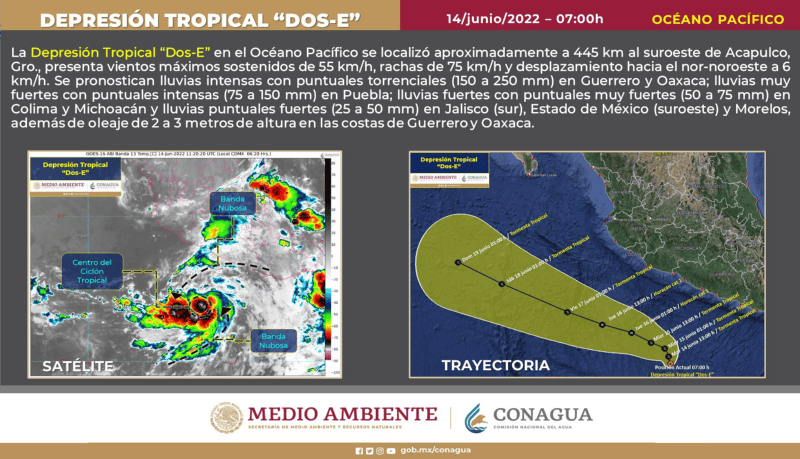 La depresión tropical “Dos-E” que se formó la madrugada de este martes al sur de las costas de Guerrero, provocará lluvias fuertes en algunas zonas del estado de Jalisco hoy martes. Según informó la Conagua, además de Jalisco, Chihuahua, Ciudad de México, Estado de México, Guanajuato, Hidalgo, Morelos, Querétaro, San Luis Potosí y Tlaxcala también registrarán fuertes lluvias el día de hoy. Prevén que las precipitaciones estén acompañadas de descargas eléctricas, vientos fuertes y probable caída de granizo. “Además podrían generar incremento en los niveles de ríos y arroyos, deslaves e inundaciones en zonas bajas de los estados mencionados”. La depresión tropical “Dos-E” se encontraba, a las 07:00 horas de hoy, a 445 kilómetros al suroeste de Acapulco y tiene vientos máximos de 55 kilómetros por hora, rachas de 75 km/h y se desplaza hacia el nor-noroeste a 6 km/h. La depresión tropical es “una zona de baja presión con potencial de desarrollo ciclónico en interacción con la Onda Tropical Número 4 y con la entrada de humedad generada por la vaguada monzónica; además de un canal de baja presión sobre el interior del país, la entrada de humedad de ambos océanos e inestabilidad en niveles altos de la atmósfera”, finalizó la Conagua.GC
