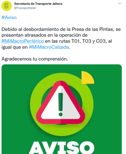Debido a las inundaciones que se reportan esta mañana por las lluvias de la madrugada, la Secretaría de Transporte informó antes de las 08:00 horas de hoy miércoles que hay fallas en la operación del Peribús en las rutas T01, T03 y C03, al igual que en el Macrobús de la Calzada.Lo anterior, debido al desbordamiento de la Presa de las Pintas, por lo que hay atrasos en las unidades, informó por medio de redes sociales.Por su parte, la Policía Vial solicitó evitar circular, debido a que se encuentra inundado, en Lauro Robles Gúzman y La Paz, en la colonia Las Pintas de Abajo, en Tlaquepaque.También en Los Tréboles y av. La Vida, colonia Los Tréboles, en Zapopan, así como en Mar del Norte y Mar Alborán, colonia Villa Fontana Aqua, en Tlajomulco.Protección Civil y Bomberos de Guadalajara informó que una unidad de transporte público se quedó varada en Isla Pantenaria al cruce con Colón, en Guadalajara.El camión resultó afectado por la lluvia en el punto, así como otros automóviles debido a que el agua alcanzó ahí los 60 centímetros. En el lugar hay un corte a la circulación.Asimismo, en Gobernador Curiel y estación Artes Plásticas, hasta la clínica 92 de Miravalle, el agua llegó a los 30 centímetros.En avenida Parres Arias, de Zapopan, un vehículo quedó varado, además, en avenida Patria hay una inundación debido al desbordamiento del canal a la altura de la calle Alberta.En Tlajomulco, hubo varios vehículos varados porque el agua alcanzó los 80 centímetros de altura en algunos puntos.Las corporaciones de seguridad se encuentran todavía haciendo un recuento de daños por las lluvias en los distintos municipios de Jalisco.gc