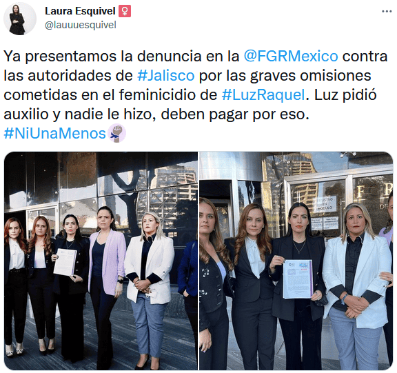 La dirigencia nacional, estatal por Jalisco y diputadas federales del PAN presentaron ante la Fiscalía General de la República (FGR) una denuncia en contra de todos los funcionarios de la Entidad, tanto estatales como municipales, que actuaron con burocracia y negligencia a pesar de existir una denuncia por amenazas, previa al ataque contra Luz Raquel Padilla, ocurrido el pasado 16 de julio y su muerte el día 20 del mismo mes.En rueda de prensa en la sede la FGR en la Ciudad de México, la secretaria de Promoción Política de la Mujer del PAN, Laura Esquivel Torres; la presidenta del PAN Jalisco, Diana González Martín; así como legisladoras federales, presentaron la denuncia y señalaron que "si hoy Luz Raquel está muerta y si hoy a Luz Raquel la quemaron viva fue por las graves omisiones de las autoridades de Jalisco".Esquivel expuso se presentó esta denuncia contra todas y todos los funcionarios que resulten responsables por estas graves omisiones."En México 11 mujeres matan todos los días y más del 97 por ciento de estos casos quedan impunes; Jalisco es el tercer estado con mayor impunidad de todo el país"."Somos hoy la voz de Luz Raquel, de su hijo Bruno, un niño autista que hoy está solo, repito, por las omisiones de las autoridades de Jalisco", insistió.Dijo que acuden a la FGR porque creemos que en Jalisco no se le dará seguimiento a este terrible y caso y nuevamente habrá impunidad en los feminicidios, en la violencia contra las mujeres.Diana Araceli González, presidenta del PAN en Jalisco, lamentó también la actuación y declaraciones de funcionarios jaliscienses ante este caso que "por desgracia no es exclusivo de esta Entidad. Algo está pasando, tenemos que evitar omisiones en el proceso, revisar los protocolos para que esto no suceda más en el país".Consideró que se deben revisar las políticas públicas que frenen este tipo de violencia y feminicidios en el país.A su vez, la diputada federal y coordinadora de la bancada de Jalisco en San Lázaro, Paulina Rubio Fernández, dijo que se exige que exista justicia para Luz Raquel y para su hijo Bruno, por ello presentaron la denuncia ante FGR."Si se requieren reformas, las impulsaremos, queremos que se revisen los protocolos a nivel municipal y estatal", concluyó.La denuncia expone que se solicita, se inicie la averiguación correspondiente y en su caso, ejercite la acción penal en contra de las y los acusados o de quien o quienes resulten responsables de las conductas narradas en esta denuncia de hechos.OA