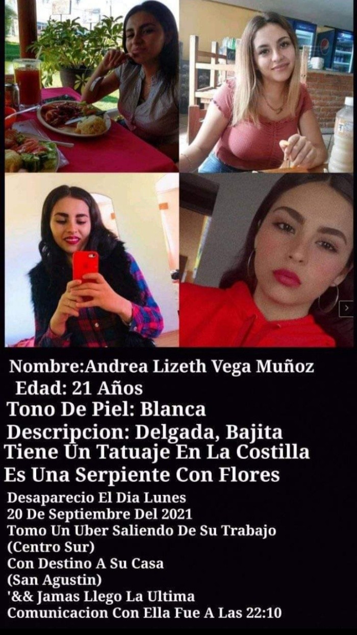 Andrea Lizeth Vega Muñoz de 21 años desapareció la noche del 20 de septiembre luego de salir de trabajar de una tienda de ropa de la plaza comercial Centro Sur, en Tlaquepaque, la última vez que su madre tuvo comunicación con ella fue a las 22:10 horas del día mencionado, su familia pide que regrese a su casa para que pueda estar con su hijo de 4 años.Su mamá, Blanca Muñoz Barrios, se encuentra desesperada por encontrarla y demanda a las autoridades localizarla o que den más pistas de su paradero, también que quien o quienes se encuentran con ella la dejen volver a su hogar en San Agustín, en Tlajomulco, que era hacia donde se dirigía luego de salir de laborar.“Simplemente, yo no voy a ir en contra de nadie, lo único que quiero es que me regresen a mi hija, y que la dejen regresar a casa, que su hijo la necesita”, dijo.La señora Muñoz Barrios describió a este medio de comunicación que la noche del lunes había salido Andrea Lizeth aproximadamente a las 21:30 horas de hacer el corte de caja del local comercial de la que ella es empleada, a las 22:10 horas se contactó con ella mientras viajaba en un vehículo de plataforma, había llegado a un punto cercano a su hogar afuera de una tienda de convencía, la progenitora escuchó que Andrea dialogó con el chofer quien le estaba cobrando el viaje, accedió y le solicitó que cerrara el viaje en una cantidad en efectivo, en ningún momento la sintió nerviosa.Pasaron los minutos y la madre de Andrea ya no pudo tener comunicación con ella. Al insistir los mensajes no llegaban, las llamadas a su número celular iban directo al buzón de voz, la preocupación siguió y a las 13:00 horas del martes 21 tomó documentos de su hija e interpuso una denuncia por desaparición, la cual quedó registrada como la carpeta de investigación 28320-2021.En cuanto a los rasgos físicos de Andrea, su tono de piel es blanco, es de complexión delgada y estatura baja. La noche que desapareció Andrea vestía mallas en color negro, un suéter tejido color café tipo blusón y zapatos cerrados en color negro; otra de sus señas particulares es un tatuaje de una serpiente con flores en un costillar.El novio de Andrea Lizeth se encuentra en la Ciudad de México trabajando, y se comunica con la señora Blanca desde las primeras horas que no se supo nada de ella.Por otra parte, Blanca Muñoz dijo que ha estado en constante comunicación con la Fiscalía del Estado, pero que no observa avances significativos en las investigaciones.“Me ha dicho que aún no se han acercado a Uber porque dicen que no tenían el oficio, y de hecho el lunes les hablé y les dije qué avances me tienes de mi hija, ya son varios días y no me tienes ninguna respuesta; hasta ahora no me han dicho nada”, destacó.Si posee información que pueda servir para localizar a Andrea Lizeth Vega Muñoz, favor de llamar a la Comisión de Búsquedas de Personas del Estado de Jalisco, al teléfono 33 3145 6314, o escribir al correo electrónico: comisiondebusqueda@jalisco.gob.mx.Si te interesó esta noticia y quieres saber más, entonces descarga y descubre INFORMAPlus, la aplicación digital de EL INFORMADOR, en donde tenemos contenidos exclusivos, seleccionados por nuestros editores, para darles una experiencia más completa a los lectores.Descarga la aplicación y pruébala GRATIS por treinta días.Para iOS: https://apple.co/35jaVgb Para Android: https://bit.ly/3gwVSEVSi eres suscriptor de EL INFORMADOR tu acceso está incluido, solicítalo al 33 3678-7777.