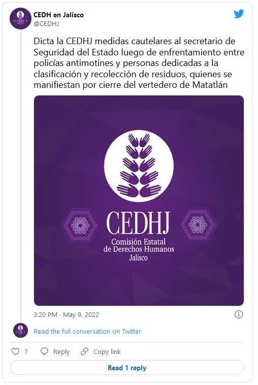 Luego de que 67 recolectores de basura fueran detenidos tras un enfrentamiento que protagonizaron en el Centro de Guadalajara con elementos de la Secretaría de Seguridad del Estado (SSE), la Comisión Estatal de Derechos Humanos en Jalisco (CEDHJ) dictó medidas cautelares y brindó acompañamiento a los aprehendidos.Las medidas cautelares van dirigidas al secretario de Seguridad, Juan Bosco Agustín Pacheco Medrano.“Se pide a la autoridad señalada que instruya a los elementos policiales a que proporcionen la vigilancia necesaria para que se garantice el derecho a la libre reunión, asociación y manifestación, respetando a quienes se manifiesten conforme a nuestra carta magna”, se lee en un comunicado en la cuenta de Twitter de la CEDHJ.Además, la Comisión solicitó que no se utilice la violencia de ninguna manera, y que en todo momento el diálogo sea persuasivo, sin intimidación, amenaza o privación de la libertad, sin que previamente exista falta administrativa o delito cometido en flagrancia.“En caso de la detención de algunas personas, que se pongan estas de inmediato a disposición de la autoridad competente, y se les permita realizar las llamadas telefónicas establecidas por las leyes, así como la visita de algún familiar”, dice otro tuit.Ante estas 67 detenciones, además del reporte de cinco recolectores lesionados en la trifulca, la CEDHJ pide que se justifiquen las aprehensiones y se respete su integridad.“En caso de justificarse alguna detención, se respete la integridad de la persona, no se le someta a violencia física o psicológica y se evite toda incomunicación, brindando información fidedigna sobre su localización a familiares y personas defensoras”, detalla el post.También, la CEDHJ destacó que desde el pasado 6 de mayo comenzaron con las medidas cautelares con el arribo de 150 pepenadores al primer cuadro de la ciudad, justo enfrente de Palacio de Gobierno. Las medidas solicitan observación a la subsecretaría de Derechos Humanos, a la síndica municipal del ayuntamiento de Guadalajara, al comisario de la Policía de Guadalajara, y la comisaría Vial del Estado.Y a las 17:00 horas la Comisión Estatal de Derechos Humanos en Jalisco dijo que se encuentra en los juzgados municipales de Guadalajara con el propósito de brindar acompañamiento a las personas dedicadas a la clasificación y recolección de residuos que fueron detenidas, luego del enfrentamiento con policías antimotines.JM