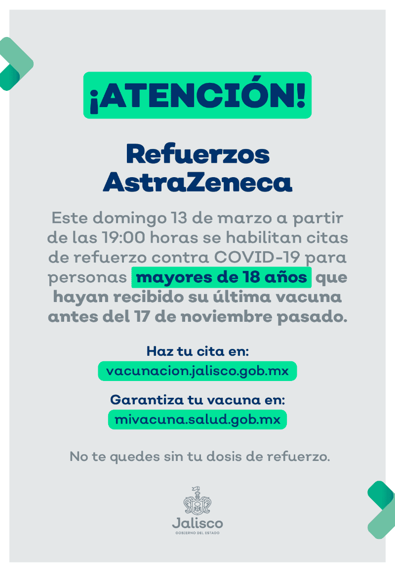 La Secretaría de Salud Jalisco (SSJ) informó que los mayores de 18 años ya pueden registrarse para acudir por su vacuna de refuerzo contra el COVID.En esta ocasión, los centennials tendrán su tercera dosis con el biológico de Astrazeneca.El refuerzo de 18 años y más es para quienes se aplicaron su última dosis antes del 17 de noviembre.En los próximos días se abrirán más espacios para quienes se vacunaron después de esa fecha.https://vacunacion.jalisco.gob.mxLa plataforma ya cuenta con citas disponibles para dosis de refuerzo en personas de más de 18 años en adelante.Además, de esa campaña de vacunación para centennials, está abierta en la Entidad la plataforma para el registro de la primera dosis para rezagados mayores de 18 años, así como la segunda dosis con AstraZeneca a mayores de 18 años con la primera inoculación antes del 17 de enero.También pueden registrarse para primera dosis los adolescentes de 12 a 17 años con factores de riesgo; y se invita a la aplicación de la segunda dosis del mismo grupo de edad, cuyos adolescentes tuvieron la primera dosis del biológico antes del 11 de febrero.