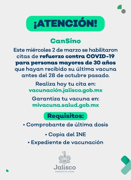 La Secretaría de Salud Jalisco (SSJ) informó hoy jueves que ya habilitaron más citas para el refuerzo de vacunación contra el COVID para personas mayores de 30 años.La dependencia señala que la convocatoria es para aquellas personas que hayan recibido su última dosis hasta el 28 de octubre del año pasado.Este refuerzo que se aplica es del biológico Cansino, el cual es seguro y funciona para proteger contra el virus que provoca el COVID-19.La plataforma para hacer la cita es vacunacion.jalisco.gob.mx/El Gobierno de Jalisco informó que ya analiza el retiro de los macromódulos de vacunación para el siguiente mes, por lo que serían las últimas semanas de la aplicación de biológico en dichos centros.Además del refuerzo para mayores de 30 años, también hay jornadas de vacunación abiertas para primeras dosis de adolescente de 12 a 17 años con factores de riesgo y segunda dosis de Astrazeneca para mayores de 18 años.GC