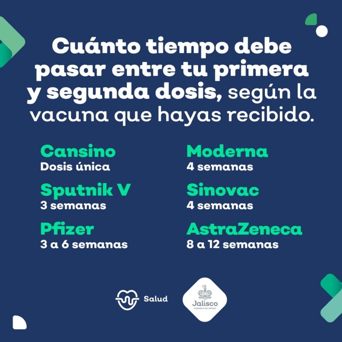 La vacunación contra el COVID-19 está avanzando considerablemente en todos los estados de México desde que inició dicha campaña en diciembre del año pasado. Hasta el momento, el Gobierno mexicano ha autorizado la aplicación de las vacunas Pfizer, AstraZeneca, Moderna, Sputnik V, Sinovac y CanSino, y a excepción de esta última, el resto de las vacunas requieren dos dosis para obtener el esquema completo y así obtener una mejor protección contra el COVID-19. Ante esto, la espera para estar completamente vacunados puede parecer larga, e incluso excesiva, sin embargo, la Secretaría de Salud Jalisco (SSJ) compartió el tiempo de espera entre la primera y segunda dosis, dependiendo la farmacéutica, para que estés completamente vacunado. La vacuna de la farmacéutica estadounidense requiere un mínimo de cuatro semanas entre ambas dosis. El tiempo para aplicarse la segunda dosis de la vacuna creada por el laboratorio de Estados Unidos, debe ser de entre 3 y 6 semanas. La segunda dosis de la vacuna contra el COVID-19 elaborada en Rusia debe ocurrir tres semanas después de haberte inoculado por primera vez. Para recibir la segunda dosis de esta vacuna china, debes esperarte cuatro semanas.Una vez que recibiste la primera dosis de esta vacuna contra el COVID-19, debes esperar de 8 a 12 semanas para completar tu esquema y así, evitar complicaciones por dicha enfermedad. Hasta el momento, México ha vacunado a casi cien millones de mexicanos contra el COVID-19. Cabe destacar, que el Presidente Andrés Manuel López Obrador (AMLO) se propuso como meta vacunar a todos los mexicanos, al menos con una dosis, para el mes de octubre.Actualmente, Jalisco continúa completando esquemas de vacunación contra el COVID-19 en algunos municipios del interior del Estado como Tepatitlán, Arandas, San Julián, Acatlán, Zapotlanejo, entre otros.