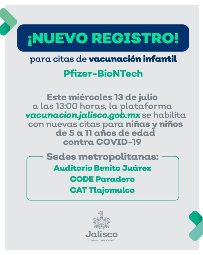 Luego de que las primeras citas para vacunas a menores de entre cinco a 11 años se agotaran tan solo 24 horas en https://vacunacion.jalisco.gob.mx, será este miércoles a mediodía cuando la plataforma abra de nuevo para continuar vacunando a las y los niños a partir de la siguiente semana.Así lo anunció este lunes el Gobernador de Jalisco tras la visita de supervisión hecha en el macromódulo Auditorio Benito Juárez, uno de los dos puntos donde se aplica la vacuna especial del laboratorio Pfzier-BioNTech contra Covid-19 que llegó a nuestra Entidad el pasado 25 de junio.“Todo el modelo de cita ya va avanzando, evidentemente se trata de hacer una logística con algunas adecuaciones, pero es importante que la gente sepa que esta vacuna que se le está aplicando a los menores es una vacuna especial de Pfizer. Invitamos a todos a que hagan sus citas, se va a abrir la plataforma a partir de mañana para la semana próxima (comenzar a aplicar las nuevas vacunas), ya esta semana está llena”, explicó el gobernador.Señaló que la respuesta de las y los jaliscienses para inmunizar a este sector etario ha sido muy buena, logrando vacunar, en promedio, a ocho mil niñas y niños diariamente en ambos módulos, los cuales han sido ambientados con temáticas infantiles para que los menores reciban su dosis.Las vacunas también se aplicarán en el Interior del EstadoComo ya se había adelantado el domingo, de las 198 mil nuevas vacunas que llegaron a Jalisco el pasado viernes 8 de julio, algunas serán destinadas a las distintas regiones sanitarias del interior del Estado, confirmó este martes el secretario de Salud Jalisco, Fernando Petersen.“Ya estamos trabajando en la zona metropolitana con cita, esa es una de las cosas diferentes, todas las personas tendrán que venir con cita y la otra situación es que la próxima semana ya empezaremos en el interior del estado debido a que se requiere que se capacite todo el personal del interior del estado para la aplicación de esta vacuna”, añadió el secretario.Asimismo, Petersen Farah indicó que a partir del próximo 20 de julio nuevamente se suma, para la vacunación de niñas y niños de la ZMG, el Centro Administrativo de Tlajomulco (CAT) a los macromódulos Auditorio Benito Juárez en Zapopan y CODE Paradero en Guadalajara.Los macromódulos, señaló, cuentan con el apoyo de personal profesionalizado en urgencias médicas de Cruz Roja, además habrá pediatras y personal médico de apoyo del ISSSTE, del Colegio de Pediatría de Jalisco y del OPD Servicios de Salud Jalisco.Ante dudas sobre las contraindicaciones absolutas y situaciones específicas para la aplicación de la vacuna en niñas y niños se puede consultar la Ruta de la Vacuna en el siguiente enlace: https://coronavirus.jalisco.gob.mx/ruta-de-la-vacunacion