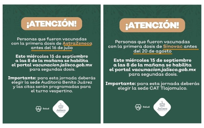 El Gobierno de Jalisco informó la mañana de este miércoles que está, nuevamente, abierto el registro en la plataforma vacunacion.jalisco.gob.mx/ para que todas las personas de 18 a 29 años que residan en la Zona Metropolitana de Guadalajara (ZMG) puedan anotarse y recibir la primera dosis de la vacuna contra el COVID-19. Asimismo, el registro también quedó abierto para las personas que están a la espera de la segunda dosis de AstraZeneca o Sinovac.Para este caso, solamente podrán agendar su cita las personas que recibieron la primera dosis de AstraZeneca antes del 16 de julio, y en caso de Sinovac, los que se vacunaron antes del 20 de agosto.Autoridades estatales resaltaron que para completar el esquema de AstraZeneca, la vacunación se realizará únicamente en el Auditorio Benito Juárez en el turn vespertino, mientras que los de Sinovac deberán elegir como sede el CAT Tlajomulco.Actualmente, Jalisco ya está vacunando al sector poblacional mayor de 18 años y justo el pasado 1 de septiembre se confirmó que ya se vacunó a la mitad de los habitantes del Estado.Al llegar al macromódulo de vacunación, deberás presentar:Si te interesó esta noticia y quieres saber más, entonces descarga y descubre INFORMAPlus, la aplicación digital de EL INFORMADOR, en donde tenemos contenidos exclusivos, seleccionados por nuestros editores, para darles una experiencia más completa a los lectores. Descarga la aplicación y pruébala GRATIS por treinta días. Para iOS: https://apple.co/35jaVgbPara Android: https://bit.ly/3gwVSEVSi eres suscriptor de EL INFORMADOR tu acceso está incluido, solicítalo al 33 3678-7777GC