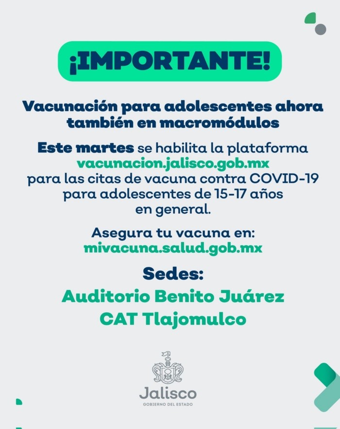 La Secretaría de Salud Jalisco informó este lunes que abrió de nuevo el registro para la primera dosis de la vacuna contra COVID-19 a menores de 15 a 17 años, con la inclusión de los macromódulos de Tlajomulco y el Auditorio Benito Juárez, en Zapopan, como sedes de vacunación.El pasado viernes se abrió por primera vez el registro estatal para este grupo de edad en 39 sedes en Jalisco, luego de que la Federación aprobara la aplicación del inmunológico.Se requiere ingresar CURP. En el grupo de 15 a 17, se requiere tener 15 años cumplidos al 15 de enero de 2022 o más.Los jóvenes que agendaron su cita la semana pasado recibieron la vacuna hoy martes en 39 unidades médicas de la Zona Metropolitana de Guadalajara y el interior del Estado.Ayer, Jalisco recibió 200 mil 070 dosis de vacunas contra COVID-19 de los laboratorios Pfizer-BioNTech, las cuales, dijo la Secretaría de Salud Jalisco, serían destinadas a adolescentes de 12 a 14 años en condición de vulnerabilidad, para personas de 15 a 17 años en general y para segundas dosis de quienes lo requieran.Para más información sobre las jornadas de vacunación vigentes en Jalisco, consulta: https://coronavirus.jalisco.gob.mx/ruta-de-la-vacunacion/Para dudas sobre el registro y vacunación:Puedes llamar de lunes a domingo, de 8:00 de la mañana a 8:00 de la noche, al call center 33 38 23 32 20.IM
