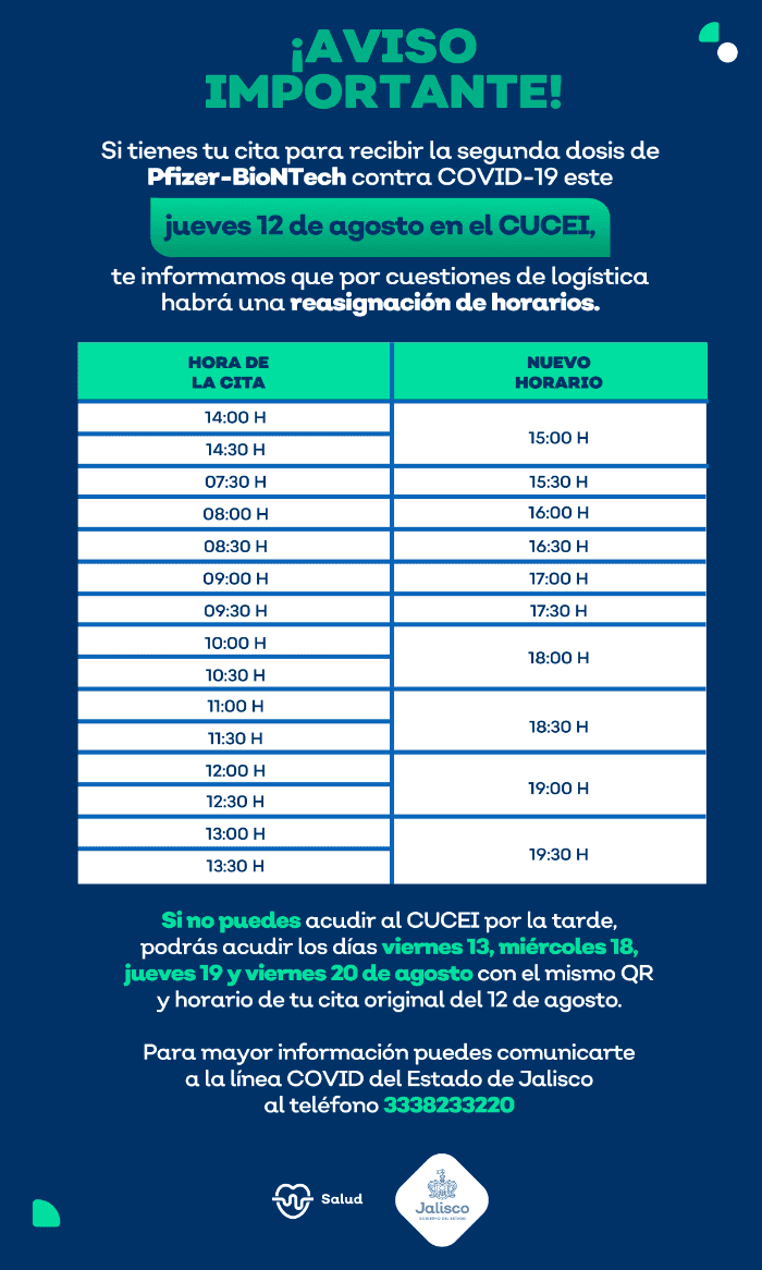 Habitantes de la Zona Metropolitana de Guadalajara que buscaban aplicarse la segunda dosis de la vacuna anti COVID-19 llegaron esta mañana al módulo de vacunación del CUCEI y se toparon con la sorpresa que habían cambiado las citas.Personas se congregaron afuera de las instalaciones del centro universitario en Guadalajara y mostraron confusión y molestia porque no se enteraron del cambio.Autoridades informaron que se le llamó a la mayoría de los citados y a otros se les envió un correo para avisarles del cambio.Ayer, la Secretaría de Salud Jalisco (SSJ) dio a conocer a través de sus redes sociales que se ajustó el horario de citas para los convocados a vacunarse este jueves 12 de agosto solo en el CUCEI (Centro Universitario de Ciencias Exactas e Ingenierías), ubicado en avenida Revolución."Esta información es ÚNICAMENTE para las personas que tienen cita para vacunarse el día de mañana 12 de agosto en CUCEI. Por razones de logística el horario de esta jornada y solo en ésta ubicación se realizarán ajustes", informó la SSJ en Twitter.Las citas entre las 7:30 y las 14:30 horas se cambiaron para este mismo jueves, pero entre las 15:00 y 19:30 horas.Las autoridades aclaron que quienes no puedan acudir hoy por la tarde, podrán presentarse los días 13, 18, 19 o 20 de agosto, en el mismo horario de su cita original, con el documento con QR que ya se les asignó.La SSJ cuenta con el teléfono 33 3823 3220 para resolver dudas al respecto con un horario de atención de 08:00 a 20:00 horas, los siete días de la semana.Si te interesó esta noticia y quieres saber más, entonces descarga y descubre INFORMAPlus, la aplicación digital de EL INFORMADOR, en donde tenemos contenidos exclusivos, seleccionados por nuestros editores, para darles una experiencia más completa a los lectores. Descarga la aplicación y pruébala GRATIS por treinta días. Para iOS: https://apple.co/35jaVgbPara Android: https://bit.ly/3gwVSEVSi eres suscriptor de EL INFORMADOR tu acceso está incluido, solicítalo al 33 3678-7777IM
