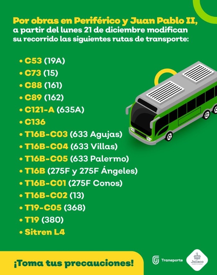 A partir del próximo lunes 21 de diciembre, 16 rutas del transporte público que circulan por esa zona modificarán su derrotero debido a obras de sustitución de tuberías en el Anillo Periférico Poniente por parte del SIAPA y por repavimentación que el Gobierno de Zapopan realizará en las laterales de la Av. Juan Pablo II.Se trata de las rutas C53 (19A), C136, T19-C05 (368), T19 (380), T16B-C03, T16B-C04, T16B-C05 (633 Agujas, Villas, Palermo), T16B (275F), T16B (275F Ángeles), T16B-C01 (275F Conos), T16B-C02 (13), C88 (161), C89 (162), C73 (15), C121-A (635A) y Sitren L4.En su recorrido de ida, las rutas C53 (19A), T19 (380), T19-C05 (368) y C136 se incorporarán a los carriles centrales del Anillo Periférico Poniente después de la Av. Santa Margarita y pasando la Av. Juan Gil Preciado se reincorporarán a su derrotero habitual. De regreso no se modifican.Las rutas T16B-C03, T16B-C04, T16B-C05 (633 Agujas, Villas, Palermo), T16B (275F), T16B (275F Ángeles), T16B-C01 (275F Conos), T16B-C02 (13), que circulan por Av. Juan Gil Preciado, después de cruzar el Anillo Periférico se desviarán hacia carriles centrales en la Av. Juan Pablo II y se reincorporan a la lateral después de la calle Pino Suárez.En su derrotero de regreso se incorporan a carriles centrales de la Av. Juan Pablo II desde la calle López Cotilla hasta Fernando Aranguren.Por su parte las rutas C88 (161) y C89 (162) también se incorporan a carriles centrales de Av Juan Pablo II, desde Anillo Periférico hasta Pino Suárez, aunque continúan por Jesús García hasta retornar en López Cotilla. De regreso circularán por carriles centrales de Juan Pablo II desde López Cotilla hasta Fernando Aranguren.La ruta C73 (15), circula por Camino a Tesistán, se desviará hacia Av. Santa Margarita, seguirá por la Avenida de los Cerezos hasta retomar su derrotero normal en avenida Arco del Triunfo. De regreso se desviará hacia la lateral de Periférico poniente, seguirá por Av Santa Margarita hasta continuar por Camino a Tesistán.A su vez la ruta C121-A (635A) se incorporará a carriles centrales de la Av. Juan Pablo II después del cruce con el Anillo Periférico Poniente, continuará por la lateral Anillo Periférico, Fernando Aranguren, Luis Enrique Williams hasta seguir por su circuito habitual en la calle Pedro Martínez Rivas. De regreso se desviará por Pedro Martínez Rivas, Luis Enrique Williams, Fernando Aranguren, lateral de Av. Juan Pablo II hasta reincorporarse a su derrotero en Av. Juan Gil Preciado.La ruta C136, de ir por avenida Tuzanía se desviará hacia Av. Arco del Triunfo, seguirá por Av. Juan Gil Preciado y se incorporará a carriles centrales de la Av. Juan Pablo II, después del cruce con el Anillo Periférico Poniente, después de pasar Pino Suárez se reincorporará a la Lateral Av. Juan Pablo II, su derrotero normal.En su circulación de vuelta, de la lateral de Av. Juan Pablo II se desviará a los carriles centrales de ésta después de cruzar la calle López Cotilla y luego de pasar por Fernando Aranguren se reincorporará a la Lateral Av. Juan Pablo II, luego por Av. Juan Gil Preciado hasta continuar su circulación por Anillo Periférico Poniente.Por último la ruta Sitren L4, de circular por Av. Juan Gil Preciado se desviará hacia carriles centrales de la Av. Juan Pablo II luego de cruzar con el Anillo Periférico Poniente, en donde retornará, y de regreso, de ir por los carriles centrales de Av. Juan Pablo II retomará su circulación habitual en Av. Juan Gil Preciado.GC