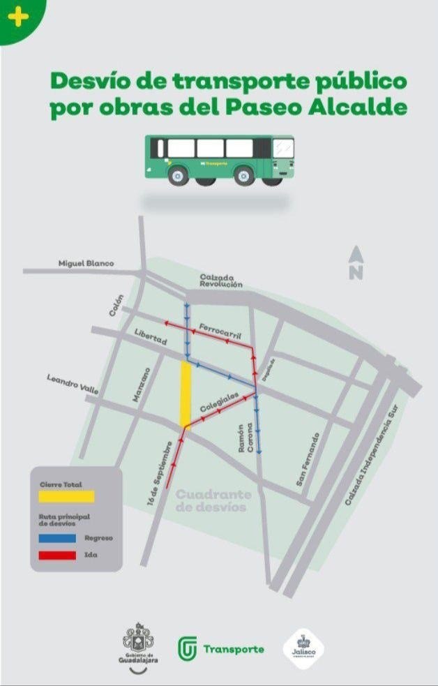 Un total de 33 rutas del transporte público modificarán su paso por la ciudad ante las obras que a partir de este lunes 27 de junio emprenderá el Ayuntamiento de Guadalajara. Los cambios se darán principalmente dentro del cuadrante comprendido entre la Calzada Independencia, Miguel Blanco/Calzada Revolución, Ocampo y Av. La PazLas obras se realizarán en el tramo de la avenida 16 de Septiembre, entre las calles Libertad y Leandro Valle, por lo que la Secretaría de Transporte (Setran) invitó a las y los usuarios de las siguientes rutas del transporte público que confluyen en esa zona a considerar las eventualidades que podrían generar estos cambios provisionales de los derroteros:En su circulación hacia el centro de la ciudad, la ruta C05 (136) se desviará de Av. 16 de Septiembre hacia Av. de la Paz, y seguirá por Colón y Ocampo. Mientras que en su derrotero del centro hacia fuera, la ruta C06 (136A) se desviará de la Calzada Independencia Sur hacia Nueva Galicia y Av. 16 de Septiembre.Las rutas C14 (175A), C31 (616), C112-1 Agaves, C127 (183 Lomas de San Agustín) en su recorrido hacia el centro por Av. 16 de Septiembre cambiarán su circulación hacia la calle Colegiales, Ferrocarril, Av. 16 de Septiembre y Miguel Blanco, y retornarán por las calles Donato Guerra, Leandro Valle y Av. 16 de Septiembre.En su recorrido del centro hacia su terminal, las rutas C118 (62), C19 (330 Boulevard), C33 (142A) y la A07 de Mi Macro Periférico (320 Circuito) de la calle Libertad se dirigirán hacia Ramón Corona, Comercio, Nueva Galicia y Av. 16 de Septiembre.Las rutas C58 (644B Pajaritos), C60 (644B Santa Isabel), C61 (644B Santibáñez) en su recorrido hacia el centro de la Calzada Independencia Sur darán vuelta hacia la calle Ferrocarril y regresarán por Ramón Corona, Comercio y Av. de la Paz.A su vez, las rutas T11A (51D Directa), T11A-C01 (51D Fortín – Tepeyac), T11A-C02 (51A Floresta – Guadalupe) y T11A-C03 (51B Moctezuma), de ida hacia el centro de la calle Libertad se desviarán hacia Donato Guerra, Leandro Valle y Av. 16 de Septiembre.Mientras que en su recorrido hacia el centro las rutas T13A (177 Alameda), T13A La Azucena (177 La Azucena), T13A-C03 Rancho Alegre (180A Rancho Alegre), T13A-C03 Silos (180A Silos), T13B (178 Azucena-El Verde (177)), T13B Lilas (178 Juanacatlán-Lilas-El Verde), T13B-C01 Cima Serena (178 Cima Serena), de circular por Av. 16 de Septiembre se desviarán hacia las calles Colegiales, Ramón Corona y Ferrocarril; en su regreso recorrerán Av. 16 de Septiembre, Libertad y Ramón Corona.Por otro lado, en su recorrido de ida, la ruta T14B-C03-2 Aranzazú (52C-V2 Aranzazú) se desviará de la Av. 16 de Septiembre hacia la calle Colegiales, Ramón Corona y Ferrocarril; retornará por Av. 16 de Septiembre, Libertad, Ramón Corona, Comercio, Nueva Galicia y Av. 16 de Septiembre.Por último, las rutas C12 (175 Santa Anita), T14A-C02 (52A Buenos Aires), T14A-C03 (52A Francisco I. Madero), T14A-C04 (52) y T14B-C02 (54 Sur Artesanos) se desviarán de Av. 16 de Septiembre hacia la calle Colegiales, Ferrocarril, Av. 16 de Septiembre y Miguel Blanco.“La Secretaría de Transporte lamenta los inconvenientes e invita a las y los usuarios del transporte a tomar previsiones en la planificación de sus viajes ante estas modificaciones”, finalizó la dependencia.GC