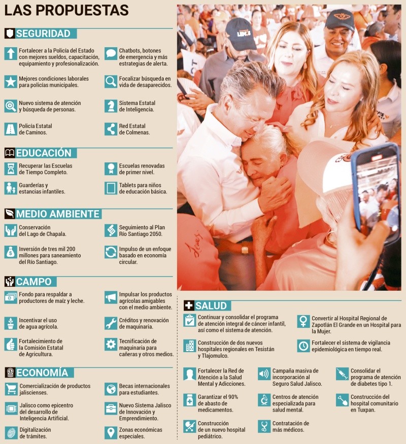 Especialistas y empresarios en sectores como salud, agricultura, agua y turismo respaldaron las propuestas presentadas por el candidato de Movimiento Ciudadano (MC) a la gubernatura de Jalisco, Pablo Lemus. Por ejemplo, Fernando Sánchez Zubieta, quien es pionero en el tratamiento del cáncer infantil en el Estado y médico del Nuevo Hospital Civil de Guadalajara “Dr. Juan I. Menchaca”, así como Georgina García, directora del Clúster Médico de Jalisco, destacaron las iniciativas del emecista en materia de salud. La salud es uno de los enfoques prioritarios del aspirante, quien impulsa la campaña de incorporación a la estrategia Seguro Salud Jalisco, la contratación de más médicos especialistas para todas las regiones, fortalecer la logística en el abasto de medicamentos, así como continuar y consolidar los programas de atención de diabetes tipo 1 y cáncer infantil, entre otras medidas. En materia hídrica, Aristeo Mejía Durán, ex director del Sistema Intermunicipal de Agua Potable y Alcantarillado (SIAPA), reconoció los planes de Lemus para garantizar el abasto y calidad del agua al realizar una inversión de más de 23 mil millones de pesos para dicha agenda durante su administración. Entre los planteamientos, se considera la renovación de la red de tuberías, un sistema inteligente para detección de fugas, la ampliación de las plantas potabilizadoras, la conservación y manejo responsable del Lago de Chapala y su cuenca, el seguimiento al Plan Río Santiago 2050 y la inyección de recursos para su saneamiento. Una agenda del alcalde tapatío con licencia que más apoyos recibió fue el turismo. Sus intenciones fueron festejadas por integrantes del sector como Bernardo Aguilar, actual presidente de la Asociación de Hoteles de Jalisco; Miguel Ángel Fong, quien fuera titular de la misma asociación, al igual que Fernanda Landa, gerente de Relaciones Públicas de la Oficina de Visitantes y Convenciones de Guadalajara. “Porque impulsará una política pública de promoción turística de todo el Estado”, señaló Landa.Los principales objetivos de Lemus en este sentido son aumentar el presupuesto destinado a los llamados Pueblos Mágicos en todo el Estado, priorizar el desarrollo turístico con un enfoque regional, cristalizar un registro estatal turístico para certificar a empresas dedicadas a este ámbito y poner en marcha un programa de apoyo a negocios y emprendimientos turísticos. Como parte de la estrategia para fomentar el turismo en el Estado, Lemus busca la construcción del Puente Federación, entre los municipios de Puerto Vallarta y Bahía de Banderas, la consolidación de la Red de Conectividad Marítima Puerto Vallarta - Costalegre e incrementar las opciones de transporte al Aeropuerto Internacional de Guadalajara y Puerto Vallarta.Ana Cristina Villalpando, productora de limón en Jalisco, y Gerardo García, productor del campo en la Entidad, refrendaron su apoyo a las propuestas de Lemus.“Fue el único candidato que integró a expertos de la sociedad civil por sector para armar su plataforma de Gobierno y generar sus propuestas”, dijo Villalpando, mientras que García acentuó que espera que Jalisco siga siendo el gigante agroalimentario de todo el país: “Jalisco, con Pablo Lemus, seguirá teniendo esta posición”.En la agenda de apoyo al campo y al sector ganadero del Estado presentada por el también empresario, se contempla un fondo especial para respaldar a productores de maíz y de leche, otorgar créditos y facilidades para la renovación de maquinaria de los productores, incentivar el uso de agua agrícola para no desperdiciarla e impulsar los productos agrícolas amigables con el medio ambiente. Lemus también contempla el fortalecimiento de la Comisión Estatal de Agricultura y la tecnificación de maquinaria para cañeras y otros medios, apoyo y rescate para la industria apícola de Jalisco que produce miel, la creación de un área especializada en recuperación de suelos en la Secretaría de Desarrollo Rural, así como una dirección especializada para apoyar a los pescadores.En infraestructura, Lemus plantea la construcción de proyectos de transporte y hospitales, tema que resaltó Bernardo Sáenz, ingeniero civil y ex titular del Colegio de Ingenieros Civiles de Jalisco: “Con su liderazgo se construirá la infraestructura que dará impulso al desarrollo de nuestro Estado”. Ian Paul Otero, ex director general de la Cámara Mexicana de la Industria de la Construcción, coincidió con que Lemus impulsará al sector económico con propuestas para favorecer el emprendimiento.“Pablo tiene la claridad y la capacidad de hacer de Jalisco el mejor lugar para emprender y el mejor lugar para invertir”. La campaña del candidato a la gubernatura de Jalisco por Movimiento Ciudadano, Pablo Lemus, se vio reforzada por el apoyo que le brindaron especialistas en distintos rubros, al considerar que sus propuestas son las mejores entre las presentadas por las candidaturas a Casa Jalisco. Una de las que más apoyos recibió fue el turismo, pues integrantes del sector como Bernardo Aguilar, actual presidente de la Asociación de Hoteles de Jalisco, Miguel Ángel Fong, quien fuera presidente de la misma asociación, al igual que Fernanda Landa, gerente de relaciones públicas de la Oficina de Visitantes y Convenciones de Guadalajara, aplaudieron al alcalde con licencia en sus propuestas.Las principales son aumentar el presupuesto destinado para los llamados Pueblos Mágicos en el Estado; priorizar el desarrollo turístico con enfoque regional; un registro estatal para certificar a empresas dedicadas a este ámbito; un programa de apoyo a negocios y emprendimientos de este sector. Como parte de la estrategia para fomentar el turismo, Lemus busca la construcción del Puente Federación, entre los municipios de Puerto Vallarta y Bahía de Banderas; la consolidación de la Red de Conectividad Marítima Puerto Vallarta-Costalegre o el incre