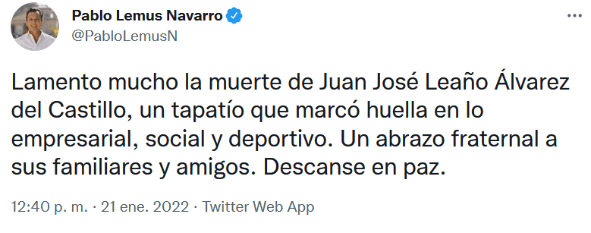 El empresario tapatío, Juan José Leaño Álvarez del Castillo murió hoy viernes 21 de enero.Leaño Álvarez del Castillo fue conocido por sus aportaciones al deporte, como dirigir la Federación Mexicana del Futbol (Femexfut) y propietario de los Tecos de la Universidad Autónoma de Guadalajara (UAG). El alcalde de Guadalajara, Pablo Lemus lamentó el fallecimiento y resaltó el trabajo que hizo el empresario."Lamento mucho la muerte de Juan José Leaño Álvarez del Castillo, un tapatío que marcó huella en lo empresarial, social y deportivo. Un abrazo fraternal a sus familiares y amigos. Descanse en paz", escribió en redes sociales.GC