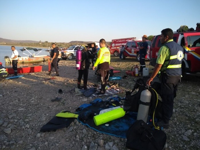 Protección Civil y Bomberos de Guadalajara trataron de recuperar los cuerpos a través de maniobras con equipo de buceo; se realizaron dos inmersiones a 10 metros de profundidad sin novedad, por lo que la búsqueda fue suspendida para continuar este lunes.
