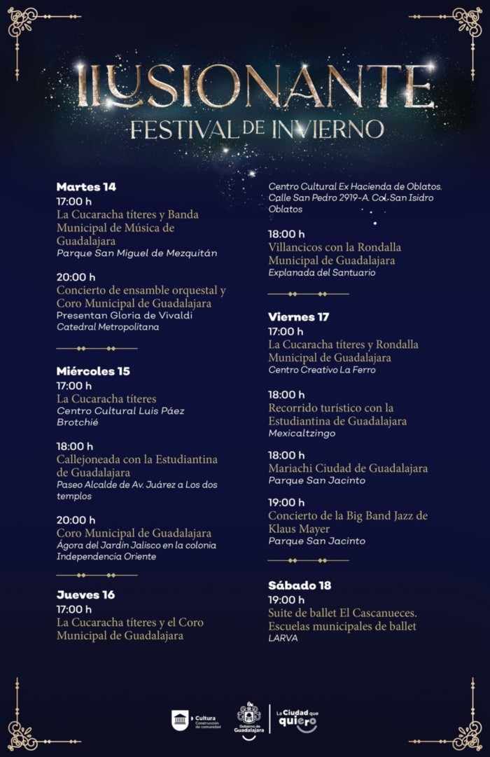 Con el encendido del árbol navideño en la Plaza Liberación, este lunes dio inicio un mes de festividades para celebrar la Navidad en el municipio de Guadalajara con “Ilusionante”.Se trata del festival de invierno que tendrá lugar en el Centro de Guadalajara de este 6 de diciembre al próximo 6 de enero en una primera etapa, y que se extenderá hacia el oriente de la ciudad a partir del día 16 de este mes.Dentro de la primer etapa, explicaron el presidente de la Canaco Guadalajara, Raúl Uranga, y el director general de la Agencia Estatal de Entretenimiento, Esteban Estrada, se contemplan ya el Nacimiento Monumental de la Plaza Liberación; el ornato del primer cuadro de la ciudad y la Casa de Santa, en el Paseo Alcalde frente a la Plaza de Armas.A partir del 9 de diciembre se contemplan presentaciones de la Orquesta Filarmónica de Jalisco en el Teatro Degollado, y cinco presentaciones de la puesta en escena de “El Cascanueces” en la zona de El Santuario y de “Los dos templos”, así como diversos espectáculos en el Paseo Alcalde.A partir del día 16, señaló por su parte el alcalde de Guadalajara, Pablo Lemus, se instalará una pista de hielo sobre el Paseo Alcalde, frente a la Glorieta de los Jaliscienses Ilustres, y una más en el Parque de la Solidaridad, además de que se instalará un mercado navideño en la Plaza de Armas y se sumará un carrusel a la Plaza Liberación.También, dijo, se presentará un nuevo videomapping en la Catedral de Guadalajara y las presentaciones de los mariachis que ya se exponen de manera habitual en el Centro Histórico contemplarán a los villancicos tradicionales, además de que el cierre diario de actividades desde ese día, será acompañado de un espectáculo de pirotecnia.De acuerdo con el gobernador del Estado, las festividades contempladas en “Ilusionante” tendrán una inversión de 40 millones de pesos, de los cuales 27.5 serán provenientes del Gobierno de Jalisco, 10 millones del ayuntamiento de Guadalajara y 2.5 por parte de la Oficina de Convensiones y Visitantes del Estado de Jalisco.También, dijo, se presentará un nuevo videomapping en la Catedral de Guadalajara y las presentaciones de los mariachis que ya se presentan de manera habitual en el Centro Histórico contemplarán a los villancicos tradicionales, además de que el cierre diario de actividades desde ese día, será acompañado de un espectáculo de pirotecnia.“Claro que 'Ilusionante' es para todas las tapatías y tapatíos, pero también para todas las personas de la Zona Metropolitana de Guadalajara, para que visiten el Centro Histórico, y por supuesto para las familias que vivien en el Oriente de la Ciudad acercándoles estos atractivos al Parque Solidaridad, además al vecino municipio de Tonalá, lo que conlleva llevarles estros atractivos a las zonas menos favorecidas de la ciudad. Estamos seguros que con todo ello vamos a hacer de Guadalajara un lugar increíble”, expresó Lemus Navarro.De acuerdo con el gobernador del Estado, las festividades contempladas en “Ilusionante” tendrán una inversión de 40 millones de pesos, de los cuales 27.5 serán provenientes del Gobierno de Jalisco, 10 millones del Ayuntamiento de Guadalajara y 2.5 por parte de la Oficina de Convensiones y Visitantes del Estado de Jalisco.Este festival de invierno, señalaron los asistentes al anuncio de su lanzamiento, beneficiará a la reactivación económica del Centro de la Ciudad, permitiendo que los negocios puedan extender su horario de servicios, sumando además la ampliación del servicio del transporte público que circula por la zona, para lo cual el secretario de Transporte, Diego Monraz, analiza qué rutas y horarios podrán beneficiar más a sus visitantes.Aunque se tomarán todas las medidas sanitarias para prevenir contagios de COVID-19, se apelará a la responsabilidad individual para que la ciudadanía no deje de usar el cubrebocas durante sus visitas a estos espacios.“La Navidad es una época significativa, no solamente porque tenemos la oportunidad de hacer una pausa en nuestros ajetreados días para estar en familia, sino porque en realidad es nacimiento, una nueva oportunidad que tenemos para llenarnos de esperanza y renovarnos. Y justo por ello celebramos que unimos esfuerzos para realizar Ilusionante, un festival que unifica los esfuerzos que cada uno hace. Porque si algo hemos aprendido durante la pandemia es que hacemos mucho más juntos que separados. Con iniciativas como esta promovemos nuestro centro, nuestra gastronomía, cultura y música, fortalecemos el tejido social, la unión familiar, e impulsamos la reactivación económica y turística de la ciudad”, añadió Raúl Uranga.GC/IM