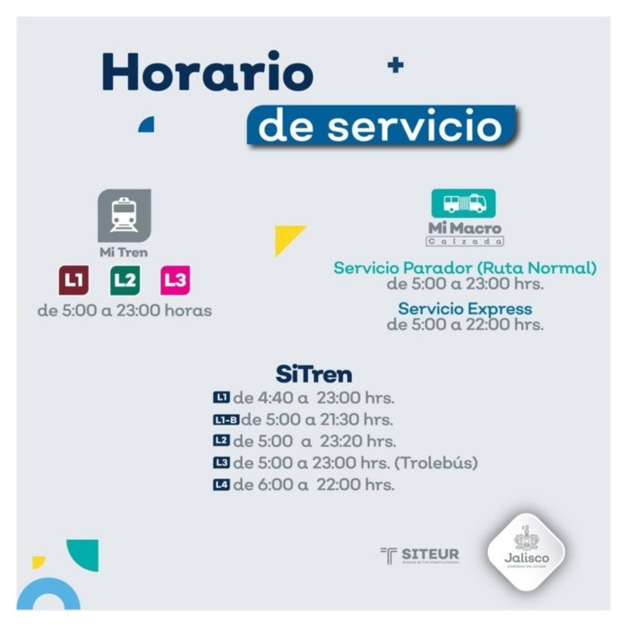 Hoy es Nochebuena, y probablemente muchas personas deberán moverse en transporte público para poder llegar a visitar a sus familias, o tendrán que utilizarlo al salir de sus trabajos para regresar a casa.Pero con ello quizá también te preguntes a qué hora dejarán de pasar hoy los camiones y el resto de sistemas del Transporte Público en la Zona Metropolitana de Gudalajara para saber si podrás llegar a tiempo o tendrás algún inconveniente, y por ello aquí te decimos cuáles serán sus horarios.Según informó la Secretaría de Transportes, los camiones no tienen autorizado terminar sus derroteros antes de lo previsto, por lo cual deberán operar en los horarios habituales conocidos por sus usuarios según las rutas y zonas.En caso de que las personas noten que alguna ruta dejó de pasar antes de tiempo puede generar sus reportes a través de las redes sociales de la Secretaría de Transportes.El único sistema que modificará su horario de operación será el Peribús, que operará hasta media hora más tarde: su servicio se extenderá hasta las 23:30 horas, aunque deberás estar en las estaciones poco antes para alcanzar a tomar tu unidad a tiempo.El resto de los sistemas, como las Líneas 1, 2 y 3 del Tren Ligero estarán en operación hasta las 23:00 horas, de la misma forma que el Macrobús en su ruta normal; su Servicio Expréss estará disponible hasta las 22:00 horas. Por último se encuentran las líneas de SiTren, cuyos horarios habituales son: L1 y L3 hasta las 23:00 horas, L1-B hasta las 21:30, L2 hasta las 23:20 horas y la L4 hasta las 22:00 horas. MF
