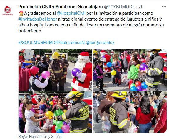 Con el ánimo de que niñas y niños con alguna enfermedad, que son atendidos en el Hospital Civil Fray Antonio Alcalde de Guadalajara, tengan un día de felicidad, este viernes la Navidad llegó hasta sus instalaciones.Fueron alrededor poco más de mil juguetes y despensas los repartidos este día por personal médico en coordinación con la Unidad de Protección Civil y Bomberos de Guadalajara, en la explanada del Hospital y en los distintos pisos del nosocomio, según informó Gisel De la Torre, coordinadora general de Calidad del Hospital Civil."Es hacerle pasar un rato agradable a todas nuestras niñas y niños que están hospitalizados actualmente y aquellos que vienen a consulta por alguna enfermedad, algunas enfermedades transitorias o crónicas, y que tengan un momento de alegría principalmente y que se vea el espíritu navideño", expresó la médico.Desde antes de las horas el personal médico disfrazado de personajes navideños y superhéroes se dieron cita en la explanada del Hospital Civil, donde las familias se tomaron fotografías al lado de los camiones y motobombas de los bomberos, así como con un réplica en tamaño real de "Mate", de la película "Cars".Los regalos comenzaron a ser repartidos en la explanada entre las niñas y niños que ese día habían acudido a alguna consulta, como lo fue Edwin, de ocho años, quien fue llevado a que le retiraran los puntos de la cirugía que tuvo el mes pasado por su hidrocefalia.Su mamá lo dejó desde pequeño, y hoy está al cuidado de su abuela, su tía y su papá. Las mujeres agradecieron a las y los médicos del hospital que nunca les han cobrado por los tratamientos de Edwin, así como por la despensa recibida este día, con la cual se ayudarán para preparar la cena navideña de esta nochebuena."Se siente muy bonito que hagan este tipo de cosas porque a ellos les hace mucha ilusión. Edwin está muy feliz con su pelota y sus dulces", dijo Johana Chávez.Tras hacer la entrega en la explanada, quienes realizaron esta actividad subieron a los distintos pisos del Hospital Civil para entregar juguetes a las y los niños que por sus condiciones no pudieron bajar, pero quienes mostraron una sonrisa por cada una de las pelotas, carritos, peluches, pinturitas y figuras que recibieron este día de cara al 24 de diciembre.OA