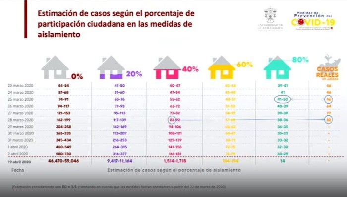 Para que los servicios de salud no queden rebasados por los contagios de COVID-19 en Jalisco, es necesario que el nivel de aislamiento en la entidad sea de al menos 60% de la población hasta el 19 de abril, dijo hoy la Universidad de Guadalajara al presentar la actualización del modelo de predicción sobre el número de posibles casos.Al estimar la participación de los jaliscienses en el aislamiento voluntario y su relación con el número de contagios, se obtiene que si el 40% lo sigue, para el 19 de abril habría entre mil 514 y mil 718 infectados. Actualmente hay 87 casos.Pero actualmente el estado no cuenta con la capacidad instalada en salud para atender tal cifra de contagios, afirmó Ricardo Villanueva, rector general de la UdeG, en la presentación."El cálculo que hemos hecho es que por lo menos los jaliscienses debemos de tener un nivel de aislamiento del 60 al 70% para garantizar la eficiencia del cuidado", afirmó.Con el 60% en aislamiento, para el 19 de abril se tendrían entre 184 y 194 casos, explicó.Si nadie se aislara, en el peor escenario, para el 19 de abril se tendrían entre 46 mil 470 y 59 mil 046. Mientras que si la medida fuera del 80% de la población, los casos llegarían a solo 14.Las medidas de aislamiento aplicadas en la entidad sí han funcionado al compararlo con el país, afirmó el rector.Del 20 al 29 de marzo, los casos confirmados de coronavirus aumentaron 196% en el estado, mientras a nivel nacional fue de 398%.Se estima que del 23 al 25 de marzo, hasta un 80% de los habitantes se quedaron en casa, pero en los días siguientes bajó al 40%. IM