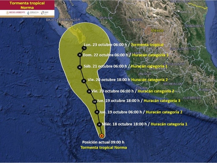 La tormenta tropical "Norma" comienza a tomar fuerza en el Pacífico mexicano y pronto será huracán, alcanzando la peligrosa categoría 3, y localizándose muy cerca de la costa de Jalisco; según el pronóstico elaborado por el Servicio Meteorológico Nacional (SMN) este miércoles 18 de octubre.De acuerdo a la proyección de la fuente climática oficial del Gobierno de México, "Norma" sería huracán, categoría 3 en la escala Saffir-Simpson, mañana jueves 19 de octubre, alrededor de las 18:00 horas, muy cerca de Jalisco: a 405 km al oeste-suroeste de Playa Pérula y a 415 km al suroeste de Cabo Corrientes.El SMN informó que la tormenta tropical "Norma" continúa fortaleciendo sus vientos y se prevé que se intensifique a huracán de categoría 1 en las próximas horas. Sus bandas nubosas ocasionan lluvias muy fuertes a intensas, vientos fuertes y oleaje elevado en el occidente y sur del país, además de reforzar la probabilidad de lluvias y chubascos dispersos en Baja California Sur, la Sierra Madre Occidental y el centro del país.El este momento, "Norma" se encuentra a 605 km al suroeste de Manzanillo, Colima, y 610 al sur-suroeste de Playa Pérula, Jalisco; en su distancia más cercana a un punto en el territorio mexicano.El desplazamiento actual del sistema es hacia el nor-noroeste (340°) a 11 km/h y mantiene vientos máximos sostenidos de 110 km/h y rachas de 140 km/h.Sus extensas bandas nubosas ocasionarán lluvias puntuales intensas en Jalisco, Colima, Michoacán y Guerrero, así como lluvias muy fuertes en Nayarit; dichas precipitaciones podrían originar incremento en los niveles de ríos y arroyos, deslaves e inundaciones en las entidades mencionadas, además reforzará la probabilidad de lluvias y chubascos dispersos en Baja California Sur, la Sierra Madre Occidental y el centro del país. Se pronostican vientos con rachas de 60 a 80 km/h, posible formación de trombas marinas y oleaje de 2 a 4 metros de altura en costas de Jalisco, Colima, Michoacán y Guerrero. Conforme a la proyección del SMN, "Norma" se convertiría en huracán categoría 1 este mismo miércoles alrededor de las 18:00 horas, cuando esté cerca de Jalisco, a 525 km al suroeste de Playa Pérula y a 540 km al suroeste de Manzanillo, Colima.Las autoridades piden extremar precauciones a la población en general en las zonas de los estados mencionados por lluvias, viento y oleaje (incluyendo la navegación marítima) y atender las recomendaciones emitidas por las autoridades del Sistema Nacional de Protección Civil, en cada entidad.Con información del Servicio Meteorológico Nacional * * * Mantente al día con las noticias, únete a nuestro canal de Whatsapp * * * OA