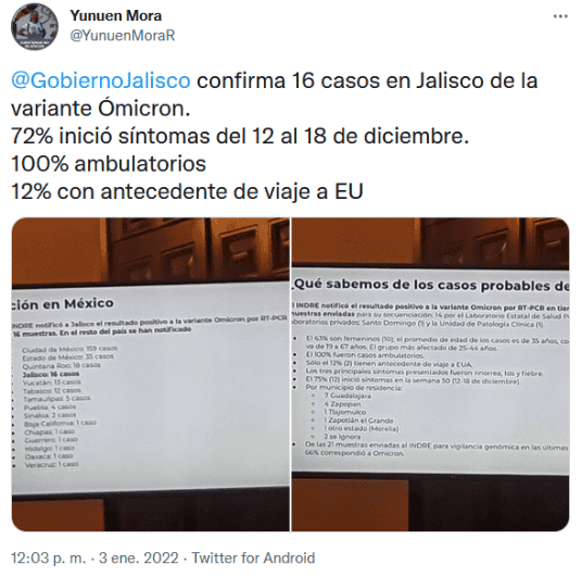 Durante una conferencia de prensa, la mañana de este lunes el Gobierno de Jalisco confirmó que en el Estado ya hay 16 casos de ómicron, la nueva variante del COVID-19.Fue el INDRE quien notificó sobre el resultado positivo a la variante ómicron en 16 muestras enviadas para su secuenciación: 14 por el Laboratorio Estatal de Salud Pública y 2 por laboratorios privados Santo Domingo (1) y la Unidad de Patología Clínica (1).El gobernador informó que, de estos casos, 63% son mujeres, mientras que el promedio de edad es de 35 años, con un rango que va de 19 a 67 años.Destacó que todos los casos fueron ambulatorios y sólo el 12% ( 2 ) tienen antecedente de viaje a Estados Unidos. Los tres principales síntomas presentados fueron rinorrea, tos y fiebre. El 75% (12) inició síntomas en la semana 50 (12-18 de diciembre).De ellos, siete residen en Guadalajara, cuatro en Zapopan, uno en Tlajomulco, uno en Zapotlán el Grande, uno en otro estado (Morelia) y de dos aún se ignora."Lo único que hay que hacer ante esta realidad es continuar con las medidas que ya conocemos, no caer en estado de alarma. Aún no hay elementos para plantear la necesidad de nuevas medidas", señaló.Sobre la idea de pedir certificado de vacuna en eventos masivos, el gobernador dijo que esta decisión se definirá hasta el 14 de enero, asimismo, reiteró que el regreso a clases presenciales se mantiene para el día 17, aunque se evaluará.gc