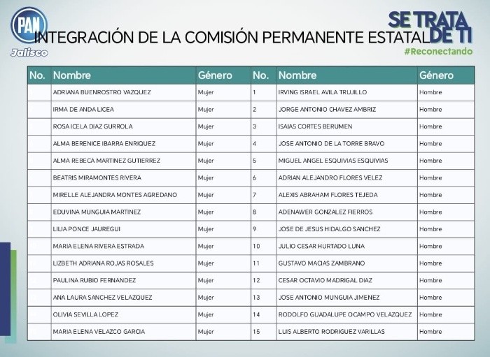Este sábado, el Consejo Estatal del Partido Acción Nacional (PAN) en Jalisco realizó su primera sesión bajo la dirección de Juan Pablo Colín, presidente del Comité Directivo Estatal, y Norma Cordero, secretaria general. Durante el encuentro, Colín reafirmó su compromiso de fortalecer los lazos del partido, destacando la necesidad de reconectar con la militancia, el electorado y el estado de Jalisco."Vamos a reconectar con nuestra familia panista, con el electorado que espera más de nosotros, y con el Jalisco que nos necesita."Uno de los puntos relevantes de la sesión fue la aprobación unánime del nombramiento de Manuel Rojas como tesorero estatal, así como la designación de 30 de los 51 integrantes de la Comisión Permanente Estatal. Este órgano estará conformado por expresidentes del PAN en Jalisco, líderes municipales destacados y coordinadores legislativos, y se encargará de garantizar que las decisiones del partido beneficien a la ciudadanía.Colín subrayó la importancia del momento para revitalizar al PAN y expresó: "El PAN, un partido con tanta historia y lucha, jamás se arrodillará ante ningún gobierno, ni estatal ni federal. Somos un partido íntegro que nunca se ha intimidado ante el poder. Nuestro mensaje debe ser claro: no permitiremos retrocesos en los valores democráticos ni en los derechos de las personas”. Además, destacó que la conformación de la Comisión Permanente Estatal es un paso clave para profesionalizar y administrar eficientemente los recursos del partido.Se espera que los 30 integrantes designados, junto con los 21 pendientes por nombrar, tomen protesta en diciembre, formando un equipo robusto para afrontar los desafíos venideros.MF