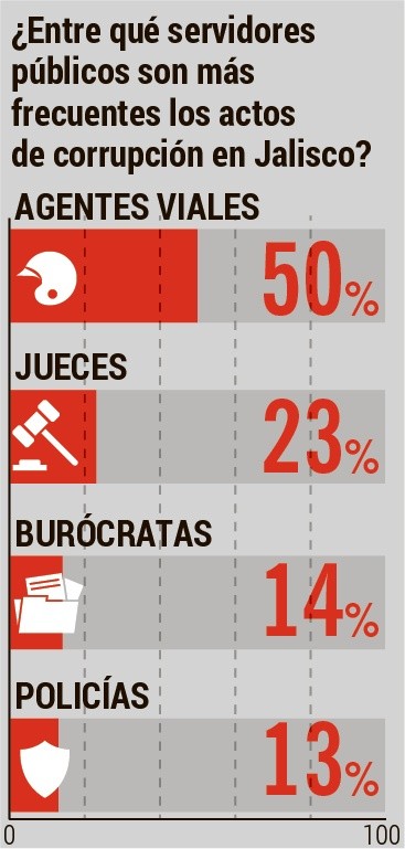 “La multa por no traer placa es de siete mil pesos”, le dijo un policía vial a Ricardo González, con la intención de extorsionarlo durante un “operativo” en Libertad y Chapultepec.El conductor aclaró que contaba con una denuncia por el robo de la lámina, pero el agente vial desacreditó el documento y lo amenazó con llevarse el auto al corralón. Como no tenía dinero para la “mordida”, le recomendó ir al cajero mientras custodiaba su auto.Ricardo necesitaba su vehículo para trabajar. Fue al banco y le dio 500 pesos al policía vial, quien le entregó “un código” para que nadie lo volviera a molestar.Mientras las encuestas del Inegi revelan que la Policía Vial y los jueces han competido históricamente por el primer lugar como la autoridad más corrupta, de acuerdo con una encuesta de esta casa editorial con dos mil 392 internautas, la mitad señaló a los policías viales como los más corruptos.Recientemente, la Fiscalía Anticorrupción de Jalisco vinculó a dos agentes viales, Gabriela “N” y Ariel “N”, por exigirle tres mil 500 pesos a una conductora que detuvieron en Enrique Díaz de León porque no tenía el comprobante de la verificación, cuando las multas iniciarán hasta enero próximo. Como no tenía dinero en efectivo, le indicaron que fuera a retirarlo en una tienda de conveniencia, pero no pudo. Por eso los agentes se molestaron y le pusieron una infracción, pero ella denunció.Juan Carlos Lucano cuenta que se descompuso su camioneta, pidió una grúa y llegó con el agente vial, quien muy amablemente le hizo saber la “cuota” que debía dar; de lo contrario, la grúa no lo levantaría. Por eso le hizo el favor de llevarlo a una sucursal bancaria para disponer de efectivo.La Fiscalía Anticorrupción del Estado investiga a 130 policías viales, tras las denuncias de afectados.En el cruce de Niño Obrero y Juan Diego, en Zapopan, hay un espacio en blanco que es aprovechado por la ciudadanía para estacionarse. Ahí se quedó Lorenzo Vargas en días pasados, pues no había línea amarilla que lo prohibiera. Tras una hora regresó y su auto ya no estaba. “Me dijeron que la Policía Vial se lo llevó en grúa. En el punto hay un señalamiento vertical que prohíbe estacionarse, pero está cubierto por ramas (además, está despintado)”. Pagó tres mil 800 pesos por la grúa, 400 por el corralón y 48 por la multa. “No tienen por qué recoger el vehículo pudiendo dejar el folio. Les pedí que pintaran la línea de amarillo, pero me contestaron que no era su problema, que era cosa del Ayuntamiento”, lamentó.