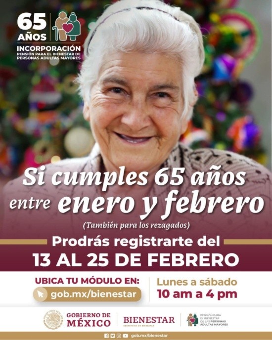 La delegación de programas para el Bienestar Jalisco informó que ya se abrieron los nuevos registros para que las personas adultas mayores reciban la Pensión del Bienestar.Se detalló que ya podrán recibir el apoyo de 4 mil 800 pesos bimestrales aquellas personas que cumplen 65 años o más entre enero y febrero.El registro se lleva a cabo del 13 al 25 de febrero y es presencial. Para ello, estarán disponibles en todo el país 2 mil 400 Módulos de Bienestar que brindarán atención de lunes a sábado en un horario de 10 de la mañana a 4 de la tarde. En caso de que la persona adulta mayor no pueda trasladarse por enfermedad u otra causa que le impida salir de su domicilio un familiar puede iniciar el trámite y solicitar una visita del personal de la Secretaría Bienestar en suhogar.Ubica tu módulo en https://gob.mx/bienestar. Verifica el día que le toca a la letra de tu apellido.Los interesados deberán llevar una identificación oficial vigente como la credencial de elector, cartilla, cédula profesional, pasaporte, carta de identidad o la credencial del Inapam.También el acta de nacimiento, el CURP (impresión reciente) y un comprobante de domicilio no mayor a seis meses, ya sea de luz, agua, gas, teléfono o predial.