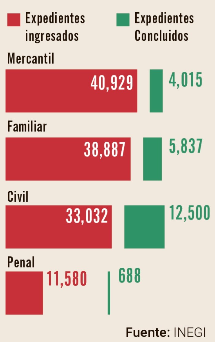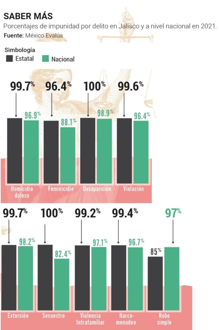 De los 33 magistrados que integran el Supremo Tribunal de Justicia del Estado (STJE), 15 confirmaron que tienen familiares en la nómina del organismo, pero no precisaron sus fechas de ingreso o sus cargos. Como respuesta a una solicitud de información, el STJE refirió que no es posible acreditar documentalmente este tipo de relaciones.Sin embargo, la Unidad de Transparencia pidió al área de Recursos Humanos que los juzgadores emitieran un pronunciamiento sobre este tema y que señalaran la fecha de entrada con la finalidad de deslindar responsabilidades conforme a lo que marca la ley. Quienes informaron que sí tienen familiares en el STJE fueron Tomás Aguilar, Antonio Flores, Guillermo Valdez, Armando Ramírez, María Eugenia Villalobos, Arcelia García, Luis Enrique Villanueva, Marcelo Romero G. de Quevedo, Gonzalo Julián Rosa, Roberto Rodríguez, Ana Cristina Espinosa, Verónica Elizabeth Ucaranza, Antonio Fierros, Federico Hernández y Espartaco Cedeño. En ningún caso se especificó cuántas personas son cercanas a ellos, la fecha de ingreso y en qué área se desempeñan. Quienes afirmaron que no tienen parientes en la nómina son el presidente Daniel Espinosa Licón, Georgina del Real, José Luis Álvarez, Adrián Talamantes, Óscar Trejo, Leticia Padilla, Mario Rojas, Francisco Castillo, Elsa Navarro, Ricardo Suro, Consuelo del Rosario González, María del Carmen López, Felipe Sánchez, Lucía Padilla, José Luis Gutiérrez, Ana Elsa Cortés y Bogar Salazar (no se ha renovado el lugar de Higinio Ramiro Ramos). Se solicitó entrevista sobre el tema con los juzgadores, pero no hubo respuesta a través del área de Comunicación Social.Para justificar el nombramiento de familiares de magistrados como jueces laborales, por ejemplo, Espinosa Licón ya contestó que son perfiles que tienen carrera judicial. “Esa es una gran familia”. TELÓN DE FONDOPara justificar el nombramiento de familiares de magistrados como jueces laborales, el presidente del Supremo Tribunal de Justicia del Estado, Daniel Espinosa Licón, sostuvo que fueron perfiles que tienen carrera judicial con años laborando en la estructura del Poder Judicial.“Hijos de jueces, de juezas, de magistradas; magistrados; son gentes que tienen 15 años, 20 años trabajando dentro del Poder Judicial; esa es una gran familia. Se cuestiona y se critica si tenemos familiares trabajando con nosotros. Al final de cuentas en el proceso de selección de jueces no participaron magistrados, salvo el magistrado José Luis Álvarez que formó parte del jurado, formaron parte dos jueces, una jueza y el director de la escuela judicial; ellos son los que hicieron el examen y quedaron videograbados, participó el sistema de participación ciudadana” argumentó.En Jalisco predomina la impunidad en la impartición de justicia y existen bajos niveles de eficiencia, de acuerdo con el informe “Hallazgos 2021. Evaluación del Sistema de Justicia Penal en México”, elaborado por la organización México Evalúa. Según el estudio presentado, el Estado registró 95.4% de impunidad, con un nivel de efectividad de apenas 4.6 por ciento. El documento detalla que revisaron la falta de atención, investigación y resolución de los casos conocidos por la autoridad, ya sea porque no se ha logrado un acuerdo reparatorio, no derivaron en alguna salida anticipada o porque se encuentran sin sentencia. En comparación con la revisión de un año anterior, el nivel de impunidad en el Estado subió, ya que en el estudio Hallazgos 2020 se reportó que quedaban sin castigo 94.5 de cada 100 delitos.Jalisco es el séptimo lugar nacional con mayor nivel de impunidad. En contraparte, Yucatán, Baja California, Chiapas, Michoacán y Guanajuato; tienen los mejores niveles de eficiencia. La media nacional de impunidad se ubicó en 91.8%, por lo que el Estado rebasa ese promedio.México Evalúa realizó un apartado de impunidad por delito: en materia de homicidio doloso Jalisco tuvo 99.7% de casos sin resolver, en feminicidio fue de 96.4% y por desapariciones llegó al 100 por ciento.“Cada delito presenta particularidades en las formas de conclusión posibles y efectivas desde una óptica del sistema penal acusatorio, y bajo la comprensión de que la justicia no se reduce al castigo. El objetivo principal de estas mediciones es contar con una fotografía más clara sobre la respuesta del sistema”, se expone en el documento. Por segundo año consecutivo el Estado se quedó con 517 de los mil 100 puntos posibles en la revisión que valora el funcionamiento del Sistema de Justicia Penal (SJP) que realiza el estudio “Hallazgos 2021. Evaluación del Sistema de Justicia Penal en México”, elaborado por la organización México Evalúa.En el análisis del funcionamiento del SJP, Jalisco se ubicó en el lugar 15 por detrás de Querétaro, Nuevo León, Coahuila, Chihuahua y Estado de México. Es el mismo puntaje registrado en la anterior evaluación, Jalisco no ha podido mejorar en la materia a pesar de haber reportado un incremento de 181% en la asignación de presupuesto para las dependencias encargadas, como la Secretaría de Seguridad Pública, la Fiscalía estatal y Defensorías Públicas. “La mayoría de los sistemas de justicia locales carecen de coordinación técnica entre los entes que los componen”, comentó Edna Jaime Treviño presidenta de México Evalúa. Añadió que esa falta de coordinación genera que la persecución penal no priorice los delitos graves como feminicidio, homicidio doloso y secuestro. Destacó que se requiere dotar de personal y herramientas a las dependencias, sin dejar de lado la coordinación.México Evalúa planteó que la consolidación del SJP requiere que cada institución tenga las condiciones necesarias para su adecuada operación. Consideraron que es indispensable un constante esfuerzo de fortalecimiento de las condicionantes de la operación de cada una de ellas.Durante el año pasado al Sistema de Justici