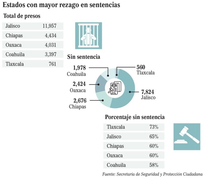 Jalisco está posicionado entre los primeros lugares con el mayor rezago en materia de impartición de justicia. De acuerdo con la Secretaría de Seguridad, es el segundo estado con el mayor número de presos sin sentencia. De un total de 11 mil 957 internos, siete mil 824 personas se encuentran en alguna de las distintas etapas del proceso judicial y sin condena. Seis de cada 10 están en esa situación. La Dirección de Prevención y Reinserción Social revela que más de mil 900 personas tienen más de dos años de prisión, pero todavía no reciben una sentencia. Entre estos se encuentra Yigal N., quien es señalado de quitarle la vida a Josué, Estefanía y Brian, tres jóvenes que circulaban por López Mateos el 17 de octubre de 2021, mientras Yigal conducía a exceso de velocidad y provocó un accidente. Existen otros casos en el país que exhiben este problema, como el de Daniel García Rodríguez y Reyes Alpízar Ortiz, detenidos tras el homicidio de la regidora panista Marigely Tamés Pérez el 5 de septiembre de 2001, y quienes siguen en prisión sin sentencia, a pesar de que la Corte Interamericana de Derechos Humanos (CIDH) determinó que “el Estado mexicano es responsable de la violación de los derechos a la integridad personal, libertad personal, a las garantías judiciales, a la igualdad ante la ley y a la protección judicial”, siendo el juicio más largo del país. Anuar García, doctor en Derecho, lamentó los números que tienen a Jalisco “en los últimos lugares en materia de impartición de justicia”, una situación que representa la incapacidad del sistema penal acusatorio para acelerar los procesos de la emisión de sentencias. “Tanto a nivel local como federal, urge, ahora que se tiene un presupuesto constitucional en el estado, una aplicación adecuada del recurso para tener más juzgados, pero también para tener un mayor control de lo que hacen los jueces, con la finalidad de evitar que se den actos de corrupción y que se permita que las personas con menos recursos sean las que generalmente se queden dentro de prisión sin obtener una sentencia”. En julio de 2023, el Congreso de Jalisco aprobó que el Poder Judicial del Estado tenga un presupuesto constitucional. Se establece que, a partir del siguiente año, este no podrá ser inferior a 2% del presupuesto del Gobierno del Estado para el ejercicio fiscal de que se trate. A nivel nacional, cuatro de cada 10 presos están sin sentencia, en promedio. Anuar García también alerta por el paro que se realiza en los Poderes Judiciales de la Federación contra la reforma judicial, ya que podría retrasar más los procesos jurídicos en la entidad, “debido a la gran carga de trabajo que se tiene”. Señaló que es válido que realicen dichas protestas, pues la situación que se avizora con la decisión del Presidente Andrés Manuel López Obrador con esa reforma será un golpe a la justicia. “Sí traería un grave retroceso, como ya sucedió en el pasado, cuando han tenido paros y nada más se van acumulando miles y miles de expedientes pendientes por resolver”.Este problema refleja deficiencias en el sistema penal acusatorio y resalta la necesidad de reformar el sistema judicial estatal y federal. El reciente presupuesto constitucional para el Poder Judicial en Jalisco es un avance, pero es esencial que se implemente eficazmente para mejorar los procesos.