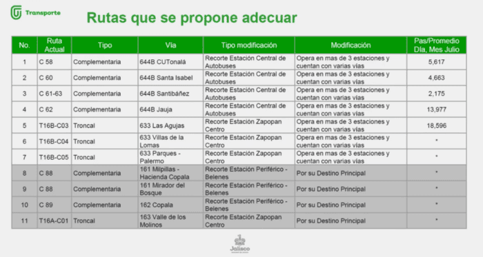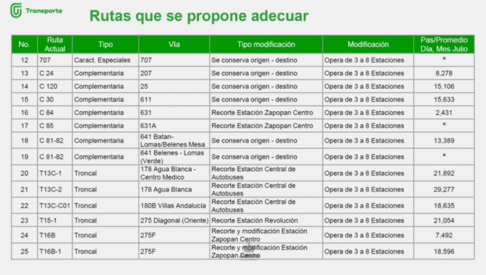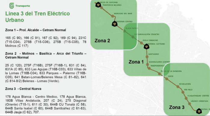 Por la apertura de la Línea 3 del Tren Ligero, habrá cambios en 25 rutas de transporte público que hacen el mismo recorrido que la nueva línea, a partir del próximo domingo 13 de septiembre.Según informó el director de Transporte de la Secretaría de Transporte (Setran), Amilcar López Zepeda, estas comparten prácticamente el recorrido de hasta 9.7 kilómetros de los 40.63 de toda la línea.Las modificaciones estarán concentradas en tres zonas, una por municipio.En Guadalajara en la estación Normal y la habilitación del Centro de Transferencia Multimodal (Cetram); en Zapopan en las estaciones Zapopan Centro y Periférico Belenes; y en Tlaquepaque en la estación Central de Autobuses.Las rutas que sufrirán cambios a partir del domingo son C90 (antes 165), C91 (166), C92 (167), C94 (169), C117 (78 Molinos), T15-C04 (275B Villas), T15-C05 (275B Higueras) y T15-C06 (275C).Mientras que las modificaciones de la Zona 2 en Zapopan arrancarán el sábado 19 y las de la Zona 3 en Tlaquepaque serán a partir del sábado 26. Las 147 rutas extras que solo cruzan la L3 tendrán cambios menores, pues el origen y destino de la demanda no está sobre el corredor o son rutas que se retornan cerca de alguna estación de la Línea por lo que, originalmente, alimentan el derrotero.“Este reordenamiento tiene el fin de mitigar la competencia entre ambos servicios, así como para garantizar que la nueva línea de Mi Tren cuente con la alimentación correcta de demanda y opere de forma coordinada con todo el sistema de Mi Movilidad, incluyendo las rutas de Mi Transporte”, señaló la Setran.NR