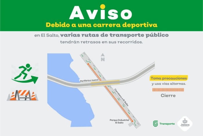 ¿Utilizas la Carretera El Castillo en tus traslados? Prepárate y toma precauciones, ya que habrá una carrera deportiva este domingo 29 de octubre.El Gobierno de Jalisco informó que algunos camiones tendrán retrasos en su recorrido debido a que el evento se realizará sobre la Carretera a El Castillo, a partir de las 7 de la mañana. “Algunas rutas del transporte público registrarán retrasos, pues circularán a contraflujo”. Las rutas que circularán a contraflujo serán: C116B, C15, C15 Reyes Heroles, C58 CU Tonalá, T13A-C02 Cima Serena, T13A-C02 Parques de la Victoria, T13A-C02 Purísima, T13B Azucena, T13B Lilas, T13B-1 Jardines, T13B-Villas, T13B-3 Salto-El Verde, T13B-C01 y T13B-C02.El recorrido del contingente de participantes inicia a un costado de la fábrica de papel San Francisco, sobre la Carretera a El Castillo en dirección hacia Parques del Castillo, en el sentido de circulación de Norte a Sur. Después llegarán a la Calle 1 donde se retornarán para continuar por la misma vía hasta encontrarse con la meta.FS