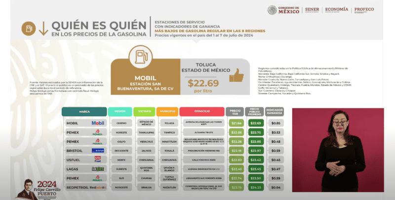 En la calle, los automovilistas revisan los precios de los combustibles cada día buscando energizar su medio de transporte con el menor dinero posible. De acuerdo con la Procuraduría Federal del Consumidor (Profeco) el precio de los combustibles en el país se encuentra en promedio de la siguiente forma:Bajo ese parámetro, en la sección "Quién es quién en los precios" se dictamina los establecimientos más altos y más bajos de México. Para la gasolina regular, el precio más bajo conseguido por litro se encuentra en Tonalá en la gasolinera Bristoil ubicada en prolongación Medrano #83. Ahí el litro se vendió en $22.97, es decir, apenas unos 30 centavos más que el preicio más bajo del país y casi un peso menos con respecto al promedio nacional.* * * Mantente al día con las noticias, únete a nuestro canal de Whatsapp * * *OB