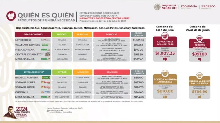 La Procuraduría Federal del Consumidor (Profeco) reveló en la sección "Quién es quién en los precios" más altos y más bajos por canasta de 24 Productos de Primera Necesidad de las zonas Centro, Centro Norte, Norte y Sur de México. Entre los establecimientos con los precios más caros se encuentra un supermercado de Guadalajara, se trata del Walmart Express Rubén Darío, cuyo precio de la canasta es de 991 pesos. También Jalisco figura con el supermercado con los precios más bajos, se trata de un Bodega Aurrerá, ubicado en Guadalajara, concretamente en la zona de Arboledas, cuyo precio por canasta básica es de 810 pesos.Estos datos corresponden a la semana del 1 al 5 de julio de 2024. *Mantente al día con las noticias, únete a nuestro canal de WhatsApp aquí: https://whatsapp.com/channel/0029VaAf9Pu9hXF1EJ561i03MV