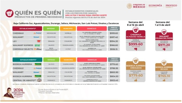 Cada lunes, en la conferencia mañanera del presidente, se dedica un tiempo para informar los precios de venta de las principales gasolinas y el precio de la canasta básica en los distintos establecimientos de venta del país en la sección de "Quién es Quién". La Procuraduría Federal del Consumidor (Profeco) hace un estudio de los supermercados registrados para un listado de productos considerados como indispensables en el día a día.La canasta básica está compuesta por los siguientes 24 productos:El estudio económico toma en cuenta al país dividido en cuatro regiones: centro, centro norte, norte y sur. En la sección de zona centro norte aparece un supermercado de Guadalajara como el comercio que ofrece el precio más bajo para esta combinación de productos.Cabe destacar que la Profeco, en coordinación con los principales supermercados y mercados, ha negociado sostener un precio máximo de $1.039 pesos para los 24 productos de la canasta básica. Sin embargo, el precio promedio nacional de venta de la canasta báscia para la semana pasada fue de $809.82 pesos. La tienda en Guadalajara que cuenta con el precio más bajo en toda la región Zona Centro es la Bodega Aurrera Arboledas, ubicada en la plaza Fiesta Arboledas sobre la dirección Av Paseo de la Arboleda 2500-z-1 en Bosques de la Victoria. El precio total para la canasta de productos de primera necesidad es de $779.60 pesos. Con respecto a la semana pasada, esta actualización de precio implicó una reducción de casi el 5%.* * * Mantente al día con las noticias, únete a nuestro canal de Whatsapp * * *OB