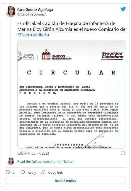 Mediante un comunicado, el gobierno municipal de Puerto Vallarta informó que, como resultado de las mesas de trabajo y coordinación en materia de seguridad pública que ha mantenido el municipio con el Gobierno Federal y el Gobierno Estatal, se acordó que el Capitán de Fragata de Infantería de Marina, Eloy Girón Alcuria, asumirá a partir de este martes como nuevo titular de la dirección de Seguridad Ciudadana, encargo para el que ya tomó la respectiva protesta de ley.El comisario de Seguridad Ciudadana de Puerto Vallarta, Israel de Jesús García Mosqueda, fue relevado de sus funciones desde este martes.Apenas ayer, Mosqueda se había reunido con sus mandos policiales para establecer primeras líneas de acción en el municipio vallartense.Cabe destacar que el viernes pasado, el alcalde de Puerto Vallarta, Luis Alberto Michel Rodríguez, había designado a García Mosqueda como su segundo al mando.JM