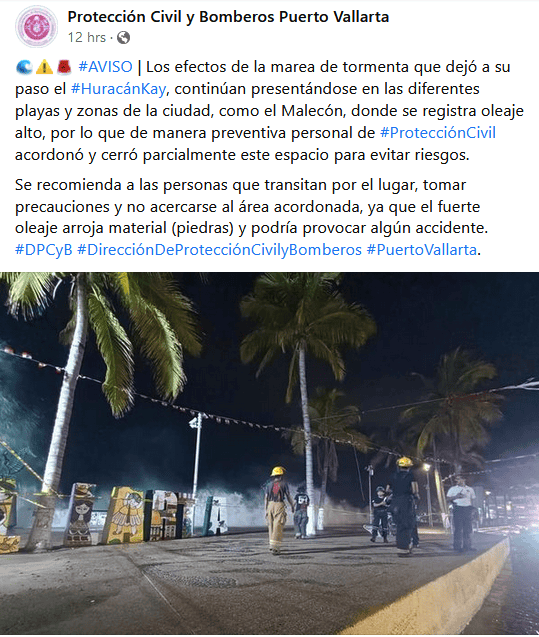 El malecón de Puerto Vallarta fue cerrado parcialmente durante la noche de ayer jueves por elementos de Protección Civil del municipio, debido a que se registró oleaje alto en la zona, esto como parte de los efectos que dejó el huracán "Kay".La mañana de este viernes, ya se encuentra abierto y la población puede transitar por la zona, con sus respectivas medidas preventivas.En un mensaje en sus redes sociales, publicado poco antes de las 22:00 horas ayer jueves, Protección Civil Puerto Vallarta detalló que "los efectos de la marea de tormenta que dejó a su paso el #HuracánKay, continúan presentándose en las diferentes playas y zonas de la ciudad, como el Malecón, donde se registra oleaje alto, por lo que de manera preventiva personal de ProtecciónCivil acordonó y cerró parcialmente este espacio para evitar riesgos".En la misma publicación, pidieron a los turistas y personas que transitan en el lugar tomar precauciones y no acercarse al área acordonada, ya que el fuerte oleaje arroja piedras y podría provocar algún accidente."Kay" se degradó a tormenta tropical la noche de ayer jueves y hasta la mañana de hoy viernes, se ubica a 265 kilómetros al nor-noroeste de Punta Eugenia, Baja California Sura, y a 215 km al sur-sureste de Ensenada.GC