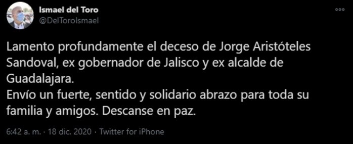 El exgobernador de Jalisco, Aristóteles Sandoval falleció la madrugada de este viernes al ser atacado a tiros en un restaurante en Puerto Vallarta, ante tal hecho varios funcionarios han compartido en redes sociales su sentir.Uno de los principales y de hecho fue quien confirmó la noticia es el gobernador de Jalisco, quien publicó un primer tuit a las 03:24 de la mañana en donde dice: "Con un profundo dolor quiero informarles que hace unos momentos el ex gobernador de nuestro estado, Aristóteles Sandoval, fue víctima de un ataque directo en Puerto Vallarta. Lamentablemente ha fallecido. Mi solidaridad con su familia en estos momentos tan difíciles."Otro fue el alcalde de Guadalajara, Ismael del Toro, quien publicó: "Lamento profundamente el deceso de Jorge Aristóteles Sandoval, ex gobernador de Jalisco y ex alcalde de Guadalajara. Envío un fuerte, sentido y solidario abrazo para toda su familia y amigos. Descanse en paz".De funcionarios que acompañaron a Aristóteles Sandoval en diversos periodos de su gestión como Gobernador de Jalisco está la reacción de Paco Ayón, ex secretario de Educación, y publica "Descansa en paz hermano... Siempre juntos". Se le sumaron otros comentarios como el de Marisol Schulz "Terrible noticia. Otra vida que se pierde por el baño de violencia que se vive en nuestro país. Esa es otra epidemia. DEP Aristóteles Sandoval".Y Alfredo Barba, "Mis más sentidas condolencias para la familia del exgobernador Aristoteles por su irreparable pérdida!"OF