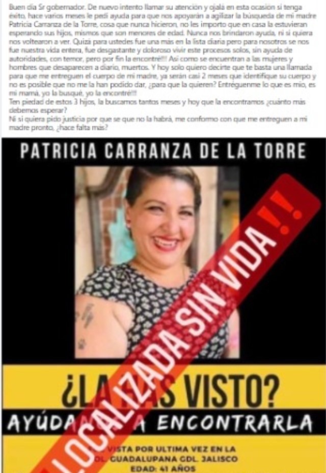 Ángela Díaz exigió en la página de Facebook del gobernador de Jalisco que por favor le entreguen el cuerpo de su madre Patricia Carranza de la Torre, quien primero fue privada de su libertad y luego fue localizada sin vida. Tras dos meses de encontrarla aún no la entregan, la Fiscalía aseguró que es porque todavía les falta más trabajo por realizar.Díaz le escribió lo siguiente al gobernador alrededor de las 12:30 horas: “De nuevo intento llamar su atención y ojalá en esta ocasión sí tenga éxito, hace varios meses le pedí ayuda para que nos apoyará a agilizar la búsqueda de mi madre Patricia Carranza de la Torre, cosa que nunca hicieron, no les importó que en casa le estuvieran esperando sus hijos, mismos que son menores de edad”, dice el post en la red social.“Y hoy sólo quiero decirte que te basta una llamada para que me entreguen el cuerpo de mi madre, ya será casi dos meses que identifiqué su cuerpo y no es posible que no me la puedan dar, ¿para qué la quieren? Entréguenme lo que es mío, es mi mamá, yo la busqué, yo la encontré. Ten piedad de estos tres hijos, la buscamos tantos meses y hoy que la encontramos, ¿Cuánto más debemos esperar?. Ni siquiera pido justicia por qué sé que no la habrá, me conformo con que me entreguen a mi madre pronto, ¿hace falta más?”, sentenció Díaz en la publicación.Por su parte, la Fiscalía de Jalisco emitió un comunicado destacando que siguen con los peritajes, textualmente dice lo siguiente: - “Derivado del trabajo permanente que lleva a cabo la dependencia estatal para la búsqueda y localización de personas desaparecidas fue posible localizar los restos de la víctima en un punto de inhumación clandestina el cual era trabajado por la Fiscalía Especial de Personas Desaparecidas (FEPD) en el municipio de Tonalá”, señaló el texto.“Una vez que el Instituto Jalisciense de Ciencias Forenses (IJCF) realizó el procesamiento de los restos localizados en el lugar y derivado de los trabajos de gabinete que lleva a cabo la FEPD se obtuvieron datos de la pre-identificación de la víctima, lo que se hizo del conocimiento de sus familiares quienes por las características físicas presumían que se trataba de la mujer que se encontraba desaparecida”, continúa el comunicado.Por último, la información salida de la Fiscalía especificó que por la condición en que se encontraron los restos, se solicitó la prueba de ADN para realizar las confrontas específicas y una vez finalizado el proceso entregaran el cuerpo a su familia, situación que aún no terminan, en todo momento señalan que han estado informando a los familiares de la víctima de aproximadamente 41 años.JM