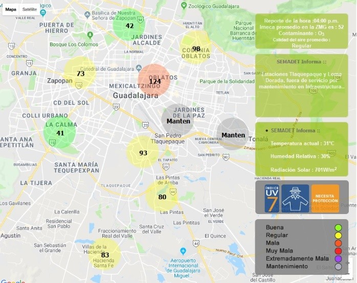 Esta tarde fue activada la alerta atmosférica en el centro de la perla tapatía tras reportar “muy mala" calidad del aire en la escala de 152 puntos Imeca, donde el principal agente es ozono; una hora después el índice disminuyó a 124 Imecas.Tras el anuncio de muy mala calidad del aire, se recomendó a niños, adultos mayores, personas que realizan actividad física intensa o que presentan enfermedades respiratorias y cardiovasculares, evitar el esfuerzo prolongado al aire libre.De igual forma también se registra Mala calidad del aire en Oblatos, con 98 Imecas, Regular en Santa Fe, Vallarta, Miravalle, Oblatos, y Las Pintas con 83, 73, 93, 98 y 80 Imecas, respectivamente; en Las Águilas se mantiene como Buena, con apenas 41 Imecas. SA