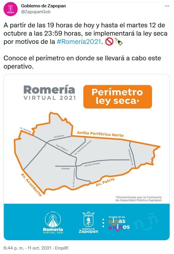 Las celebraciones de la Romería 2021 de la Virgen de Zapopan serán de forma virtual, pero se implementarán medidas similares a las de ediciones previas, como cierres viales y la Ley Seca en el polígono donde se realizará el recorrido de Guadalajara a Zapopan.Debido a que se busca evitar la congregación de personas ante la pandemia de COVID-19 en Jalisco, la imagen de la Virgen se trasladará en un vehículo el martes 12 de octubre.Autoridades informaron que este año se aplicará ley seca, es decir, la restricción en establecimientos para la venta de bebidas alcohólicas para llevar.Desde las 7:00 PM del lunes 11 y hasta las 11:59 PM del martes 12 de octubre.Se permitirá la venta de bebidas con alcohol dentro de establecimientos en los polígonos señalados, siempre y cuando cumplan con las medidas que las autoridades estatales y municipales han señalado para atender la contingencia sanitaria.Lunes 11 de octubre:Martes 12 de octubre:Miércoles 13 de octubre:La fecha marca el final del ciclo del ritual conocido como "La Llevada de la Virgen", que comenzó en el año 1734 y consiste en el traslado de la imagen de "La Generala" a varios templos y otros lugares, como hospitales, fábricas y escuelas de la ZMG. Esa serie de visitas comienza en mayo y concluye 12 de octubre con el recorrido desde la Catedral tapatía para llevar a la Virgen de regreso a su Basílica, en Zapopan.La festividad se caracteriza porque en el recorrido acompañan a la imagen miles de personas, entre danzantes, la Guardia de Honor, charros, grupos musicales y fieles de parroquias de la ZMG. Además, en las más recientes ediciones previas a la pandemia, llegó a congregar a más de 2 millones de peregrinos. En noviembre de 2018, la Romería de Zapopan fue declarada Patrimonio Cultural Inmaterial de la Humanidad de la Unesco.IM