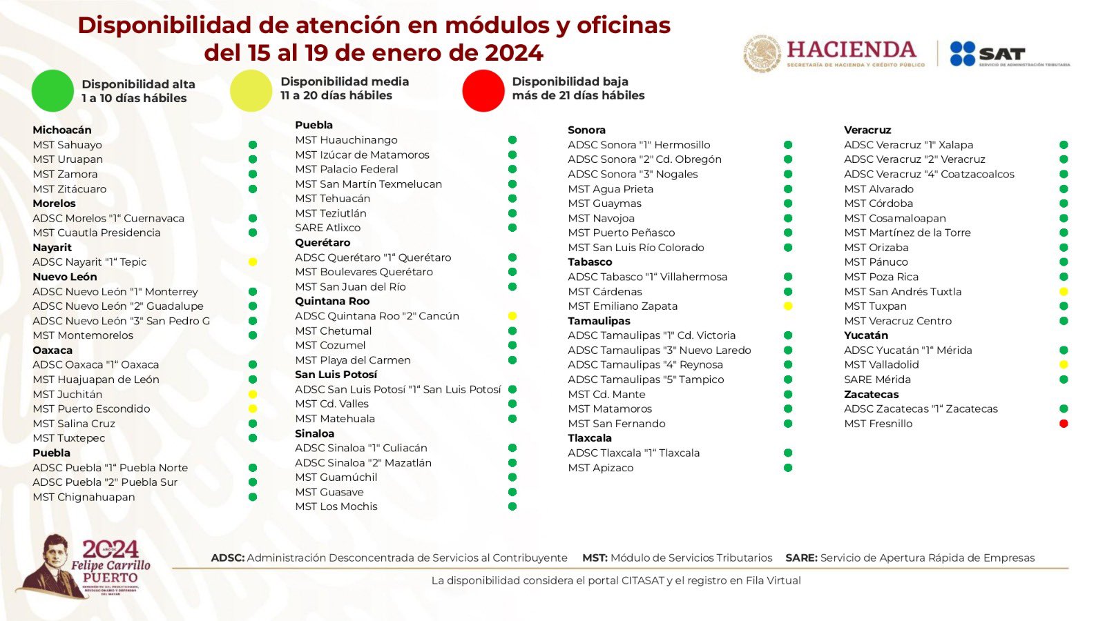 El Servicio de Admimistración Tributaria (SAT), dio a conocer a través de su cuenta oficial de X, el listado de disponibilidad de citas para atención presencial en los módulos y oficinas desconcentradas en las 32 entidades del país. La disponibilidad corresponde a la semana del 15 al 19 de enero:Aquí te compartimos la lista de los módulos y la disponibilidad de las diferentes entidades, incluyendo Jalisco:El SAT recuerda a los usuarios que los trámites son gratuitos y que garantiza tu cita a través de la fila virtual.Las personas de la tercera edad, con discapacidad y mujeres embarazadas o con menores lactantes, no requieren cita para la atención de sus trámites.Únicamente la inscripción al RFC y la generación de firma electrónica, requieren atención presencial, señala el SAT.*Mantente al día con las noticias, únete a nuestro canal de WhatsApp aquí: https://whatsapp.com/channel/0029VaAf9Pu9hXF1EJ561i03MV