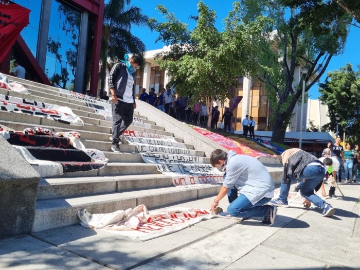 Alrededor de 200 estudiantes de la Federación de Estudiantes Campesinos Socialistas de México (FECSM) se manifestaron esta tarde en las oficinas administrativas de la Secretaría de Educación Jalisco, ubicadas en la Glorieta de la Normal.Los jóvenes, principalmente de la Escuela Normal Rural de Atequiza, recuerdan el 28 de octubre de 1988, cuando estudiantes de aquel entonces fueron reprimidos por el gobierno y falleció uno de los manifestantes.En las instalaciones de la Torre de Educación, colgaron una manta con las 15 escuelas rurales integrantes de la Federación de Estudiantes Campesinos Socialistas de México (FECSM) y entregaron un pliego petitorio.“Venimos a entregar nuestro pliego petitorio, en dicho pliego se destacan las más importantes como Normal Rural, mantenimiento en el internado hay 560 personas, las bases para los colchones no se alcanzan, hay diversas irregularidades en el comedor, desvío de recursos se está teniendo la audiencia, para que expliquen en que se gasta”, acotó un estudiante que prefirió el anonimato.La Escuela Normal Rural de Atequiza ya tiene tres semanas en paro laboral. Hasta que tengan una respuesta de la autoridades educativas, lo retiraran.Por alumno, la aportación de comedor es 75 pesos para las tres comidas del día. Señalan que la despensa ha llegado incompleta, por eso su principal petición es transparencia. JM