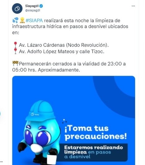 Sistema Intermunicipal de los Servicios de Agua Potable y Alcantarillado (Siapa) informó que dos pasos a desnivel permanecerán cerrados algunas horas debido a labores de mantenimiento.Por medio de redes sociales, el organismo señaló que "realizará esta noche la limpieza de infraestructura hídrica en pasos a desnivel ubicados en Avenida Lázaro Cárdenas (Nodo Revolución) y en el cruce de la avenida Adolfo López Mateos y calle Tizoc.Según estimó la dependencia, los trabajos durarán de las 23:00 a 05:00 horas de mañana jueves.