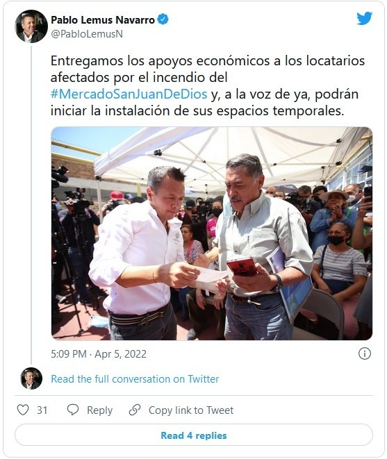El Gobierno de Guadalajara entregó 30 incentivos económicos para los comerciantes afectados luego del incendio del pasado 31 de marzo en el ala sur del Mercado Libertad, también conocido como San Juan de Dios.Cada uno de estos apoyos es por 25 mil pesos, y los locatarios que tengan más de un puesto recibirán 10 mil pesos por espacio adicional; la bolsa del recurso para la primera entrega asciende a 850 mil pesos.Pablo Lemus, presidente de Guadalajara, afirmó que para la siguiente sesión del pleno del Ayuntamiento se acercarán a los comerciantes y no se les cobrará el derecho de piso."Vamos a proponer que, para todos los locatarios (…) desde este mes no paguen absolutamente nada de plaza —renta de local— por todo lo que queda de este año 2022", dijo.Además, Lemus explicó que la reubicación de los locatarios será temporal y acorde con el giro comercial; esto en espacios como la explanada central del Mercado Libertad y las banquetas en las inmediaciones, también agradeció el apoyo de los líderes comerciantes de San Juan de Dios.La remodelación del inmueble iniciará sin generar afectaciones en polvo y ruido a los dos mil 040 comerciantes que abrieron nuevamente sus locales y será pagada por los gobiernos de Guadalajara y Jalisco.Las labores de limpieza del Mercado Libertad presentan un avance de 95 por ciento; al corte más reciente se han retirado 480 toneladas de desechos y escombro. Hoy continúan los trabajos por parte de 25 elementos operativos y seis vehículos de la Coordinación General de Servicios Públicos Municipales."Estoy convencido que este evento, que fue trágico, si lo sabemos aprovechar podrá darle muchas cosas a San Juan de Dios y hacer de este baluarte, que es este mercado, algo todavía más importante de lo que ha sido", expresó por su parte Alfredo Aceves Fernández, Coordinador General de Desarrollo Económico.JM