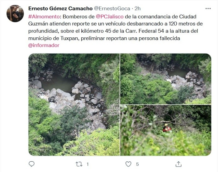 De una altura de más de 120 metros se desbarrancó un auto compacto en la carretera federal 54, en el municipio de Tuxpan, el conductor falleció. Bomberos de Jalisco reporta que se les ha complicado extraer el cuerpo.Alrededor de las 17:00 horas, elementos de Protección Civil y Bomberos recibieron el reporte de un vehículo caído de la vía federal de Colima a Ciudad Guzmán en el kilómetro 45.Al llegar, los rescatistas encontraron que a más de 120 metros de profundidad estaba un Nissan March, en color blanco, algunos elementos bajaron al punto donde estaba el automotor para realizar labores de salvamento.En el interior, los bomberos localizaron el cuerpo del conductor atorado entre los fierros del auto, ya sin signos vitales. No localizaron otras personas fallecidas o lesionadas.Por lo complicado e inaccesible de la barranca, hasta las 19:40 horas pararon las labores de extracción ya que la poca visibilidad por la puesta del sol no los dejó culminar los trabajos con el equipo hidráulico para liberar el cuerpo.Bomberos en el lugar confirmaron que en las primeras horas de mañana reanudarán las labores de extracción para entregar el cadáver a los Servicios Médicos Forenses.Si te interesó esta noticia y quieres saber más, entonces descarga y descubre INFORMAPlus, la aplicación digital de EL INFORMADOR, en donde tenemos contenidos exclusivos, seleccionados por nuestros editores, para darles una experiencia más completa a los lectores. Si eres suscriptor de EL INFORMADOR tu acceso está incluido, solicítalo al 33 3678-7777Descarga la aplicación y pruébala GRATIS por treinta días.Para iOS: https://apple.co/35jaVgbPara Android: https://bit.ly/3gwVSEVJM