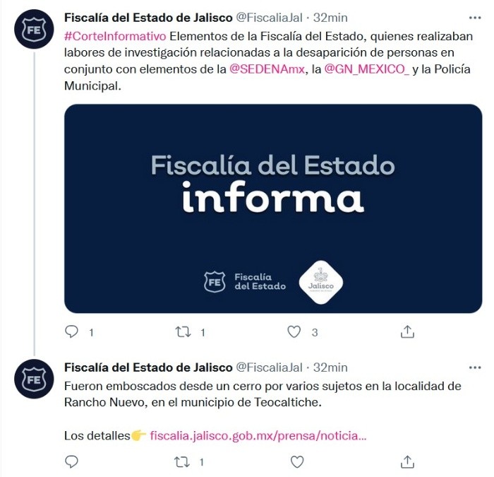 En el municipio de Teocaltiche, personal de la Fiscalía de Jalisco, elementos de la Secretaría de la Defensa Nacional, de la Guardia Nacional y la Policía Municipal fueron emboscados cuando realizaban labores de investigación relacionadas a la desaparición de personas.De acuerdo con el reporte, el ataque a balazos se registró la tarde de este jueves en la localidad de Rancho Nuevo y fue perpetrado por un grupo de sujetos fuertemente armados. Tras la agresión los elementos de las diferentes corporaciones repelieron a los civiles, llevándose a cabo un intercambio de disparos, tras lo cual los agresores se escaparon del lugar.En el informe preliminar no se precisa si hubo heridos o fallecidos en el ataque.Luego del incidente personal de diferentes corporaciones municipales, estatales y federales se desplazaron hasta el punto para brindar el apoyo al personal que fue agredido por los civiles y se desplegó un operativo en la zona con la finalidad de dar con los responsables de la agresión.JM