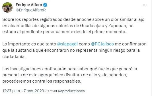 Luego de alrededor de 12 horas de que ciudadanas y ciudadanos reportaran la presencia de un extraño olor a ajo en distintos puntos de la Zona Metropolitana de Guadalajara (ZMG), esta mañana autoridades estatales confirmaron la sustancia que estuvo ocasionándolo.Se trata, dijo, de un agroquímico compuesto de disulfuro de alilo, molécula precisamente contenida en el ajo, y que en el sector puede ser utilizado para el control de plagas y enfermedades en la agricultura, por ejemplo, para semillas y cultivos. "Lo importante es que tanto el Siapa como la Unidad Estatal de Protección Civil y Bomberos Jalisco me confirmaron que la sustancia que encontraron no representa ningún riesgo para la ciudadanía", aseveró el Ejecutivo del Estado a través de sus redes sociales.Hasta el momento no se ha dado a conocer la fuente de donde provino tal sustancia. El gobernador de Jalisco añadió que las investigaciones continuarán para saber qué fue lo que generó la presencia de este agroquímico, que en caso de resultar alguna persona responsable "se procederá en su contra".Por la mañana, algunas versiones apuntaron a que el olor podía deberse a la presencia de acrilonitrilo, sustancia contenida en un camión que fue robado el pasado 15 de octubre y que resultó en la emisión de una alerta para todo el estado de Jalisco, así como a Nayarit, Zacatecas, Guanajuato, San Luis Potosí, Michoacán y Colima, pues se trata de una sustancia peligrosa e incluso mortal, si se inhala o absorbe por la piel u ojos.Sin embargo, con la versión emitida por la autoridad estatal, esta versión, por ahora, ha quedado descartada.*Mantente al día con las noticias, únete a nuestro canal de WhatsApp OF