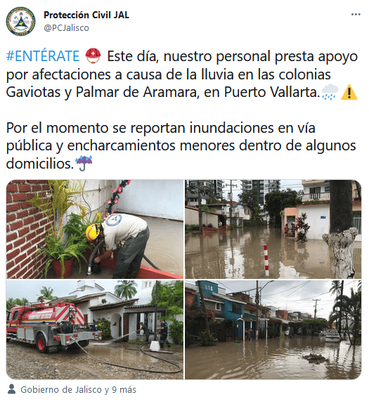 Las lluvias ya dejaron estragos en Puerto Vallarta, donde personal de la Comandancia Regional Puerto Vallarta de Protección Civil y Bomberos informó que 22 casas tienen encharcamientos menores.Esto en la calle Montesori al cruce con Océano Índico, en la colonia Palmar de Aramara, donde la vía pública se inundó.Además, en la colonia Gaviotas, un domicilio se reportó con acumulación de lodo en la cochera, sin afectación en menaje, debido al desbordamiento de un canal. En el lugar se procedió con el saneamiento.Sobre el canal de esa colonia, personal de obras públicas del municipio ya realiza labores para el retiro de palizada acumulada.La Unidad Estatal de Protección Civil y Bomberos de Jalisco detalló que, al momento, todos los principales ríos en Puerto Vallarta tienen aumento en su caudal.GC